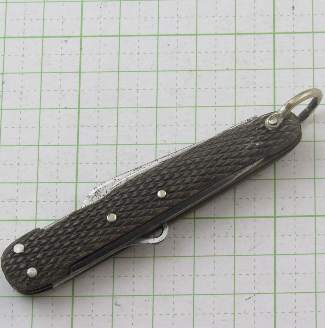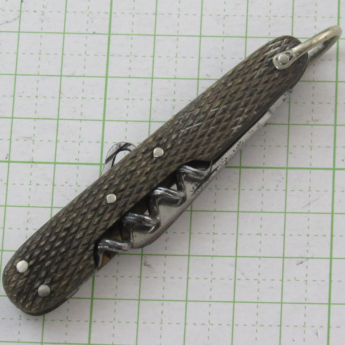 ナイフ 大・小 / ボタンフック / マニキュア用ヤスリ / 穴あけパンチコルクスクリュー(二重らせん) / ニッケルシルバー紐用環カーボン鋼 / バファローホーン(チェッカリング) / ロブスター構造刃長 48&38mm / 柄長 82mm / 厚み12mm / 重さ30g【特徴】英国シェフィールド市は18世紀に始まる産業革命の中、金属加工を主にする人達が集まり発展していった町でした。このナイフは、ビクトリア朝時代のポケットナイフの特徴を備え英国紳士が着ていたチョッキポケットに忍ばせた必需品でした。当時は炭素鋼を使用していた為、かなり錆びていたのを磨きなおしたのでメーカー名が薄れ判読できませんでした。