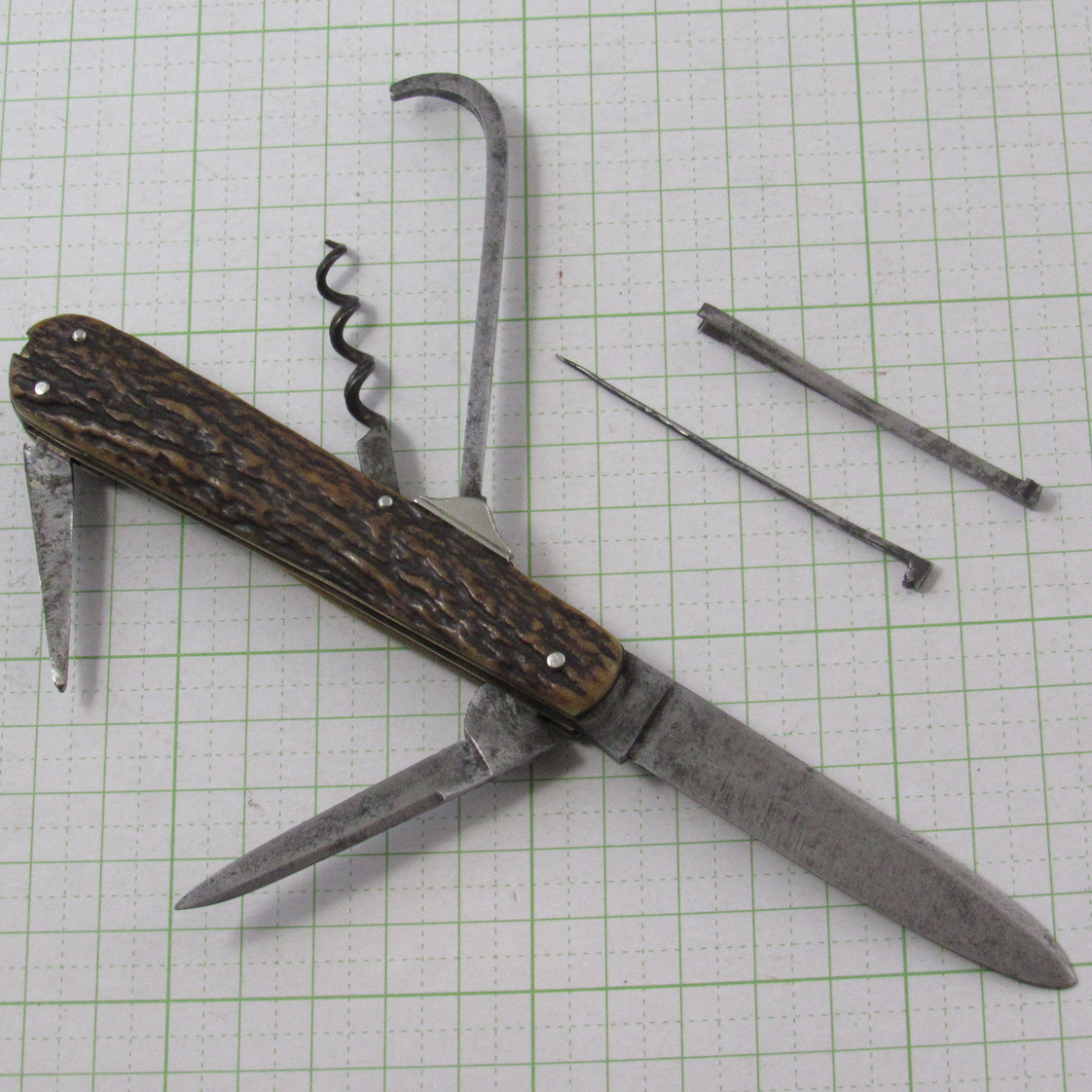 ナイフ 大・小 / ホーフクリーナー(蹄用泥掻き) /レザー用パンチコルクスクリュー(二重らせん) / ツイザー / ピンカーボン鋼 / スタッグ・ハンドル(バーシールド入り)刃長73mm / 柄長100mm/ 厚み15.7mm / 重さ90g【特徴】ウェネス・テーラー社はジョン・テーラー氏が1820年に創立し、その後1838年に目をトレードマークにしたウェネス(目撃)・テーラーに社名変更しました。同社は1879年にニーダム・バール&タイザック社に売却し1975年まで存続していました。このナイフは、インド大鹿の角をハンドル材に使い丁度よい長さモデルです。当時の乗り物といえば馬が当り前の時代でした。敷石の道路は都市部の中心にあり、ほとんどの道は舗装されていませんでした。そのため馬を使用する人はに溜まる泥を掻き出す道具が必需品で、携帯用の泥掻きが付いたホースマンズナイフが大人気でした。