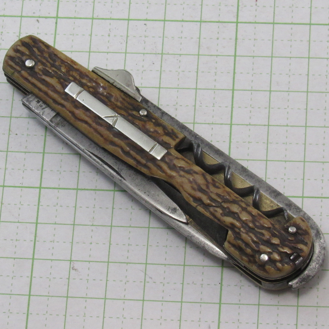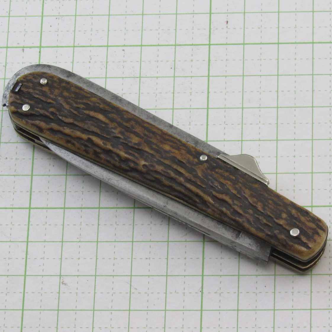 Knives large and small / Hof cleaner (hoof mud scraper) / Leather punch corkscrew (double helix) / Tweezer / Pin carbon steel / Stag handle (with bar shield) Blade length 73mm / Handle length 100mm / Thickness 15.7mm /Weight: 90g [Characteristics] The Weness-Taylor Company was founded in 1820 by John Taylor, and in 1838 the company name was changed to Weness-Taylor with eyes as its trademark.The company sold to Needham, Barr & Tysack in 1879 and remained in existence until 1975.This knife uses Indian deer antler as the handle material and has just the right length.At that time, horses were the norm for vehicles.Cobblestone roads were located in the center of the city, and most roads were unpaved.For this reason, people who used horses needed a tool to scrape out the mud that accumulated on their horses, and the Horseman’s Knife, which came with a portable mud scraper, was very popular.
