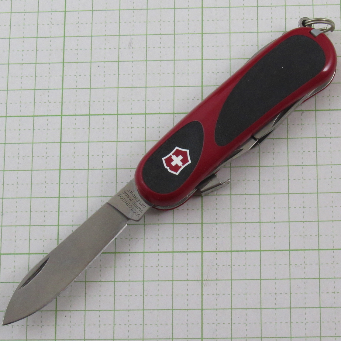 Discontinued model knife (with lock) / Toothpick / Kiri / Small blade / Tweezers / Bottle opener / Large flathead screwdriver (patented) / Can opener / Small flathead screwdriver / Corkscrew / Wire stripper / Key ring / Plastic & Rubber handle handle length 85mm / Blade length 65mm / Handle thickness 17.2mm / Weight 55g *12 functions *Stainless steel