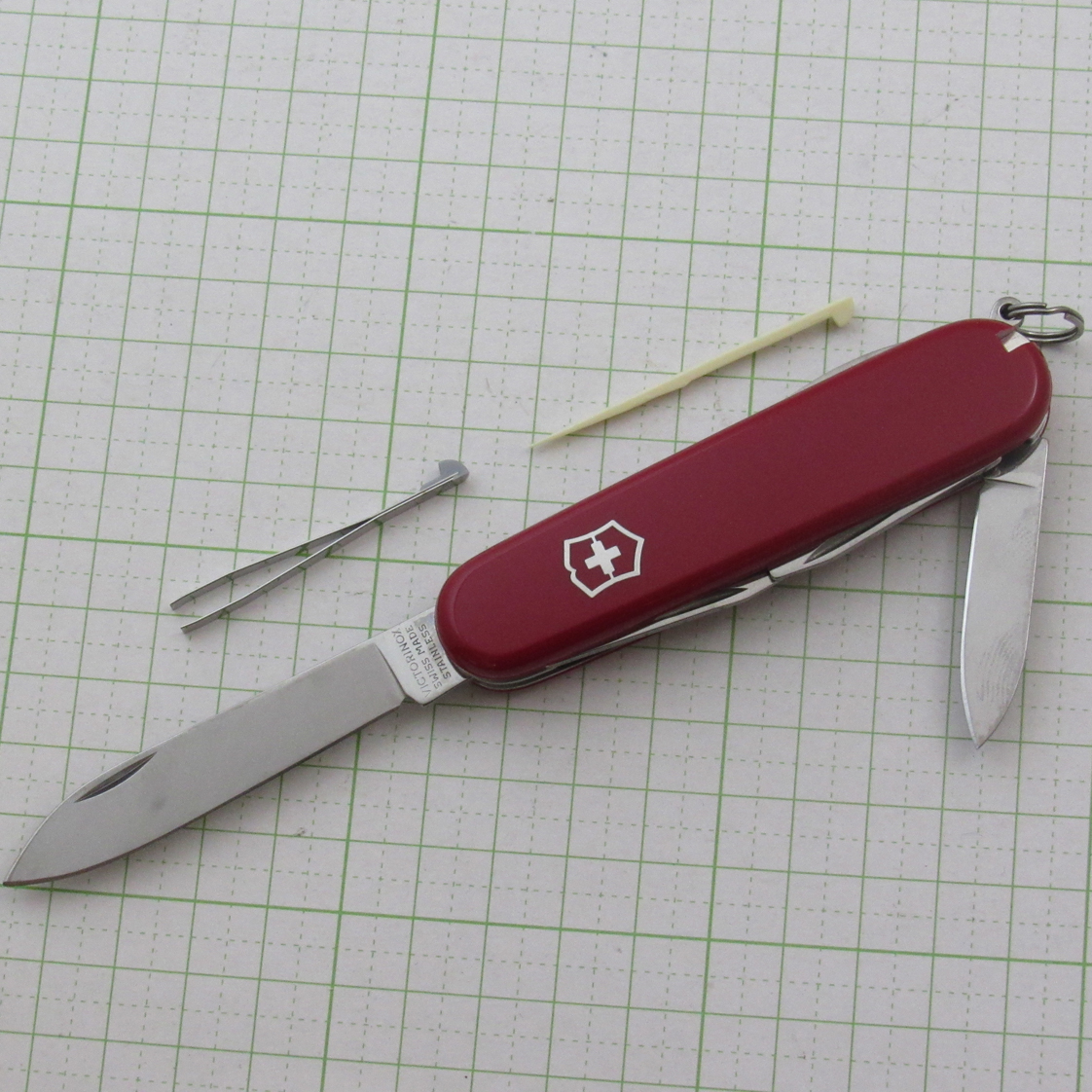 12-function large blade / Flathead screwdriver large and small / Wire stripper bottle opener / Reamer (drilling) / Sewing eye / Can opener / Phillips screwdriver tooth pick / Tweezers (tweezers) / Key ring handle length 91mm / Blade length 68mm & 41mm / Handle thickness 14mm / Weight 55g