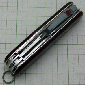 Large blade / Small blade / Corkscrew / Can opener / Bottle opener / Tweezers (tweezers) / Flathead screwdriver (large and small) / Wire stripper Reamer / Sewing eye / Two-spic / Glasses screwdriver / Phillips screwdriver Light (white LED) CR1225 2 batteries / Key ring Handle length 91mm / Blade length 68mm & 41mm / Handle thickness 19mm / Weight 80g