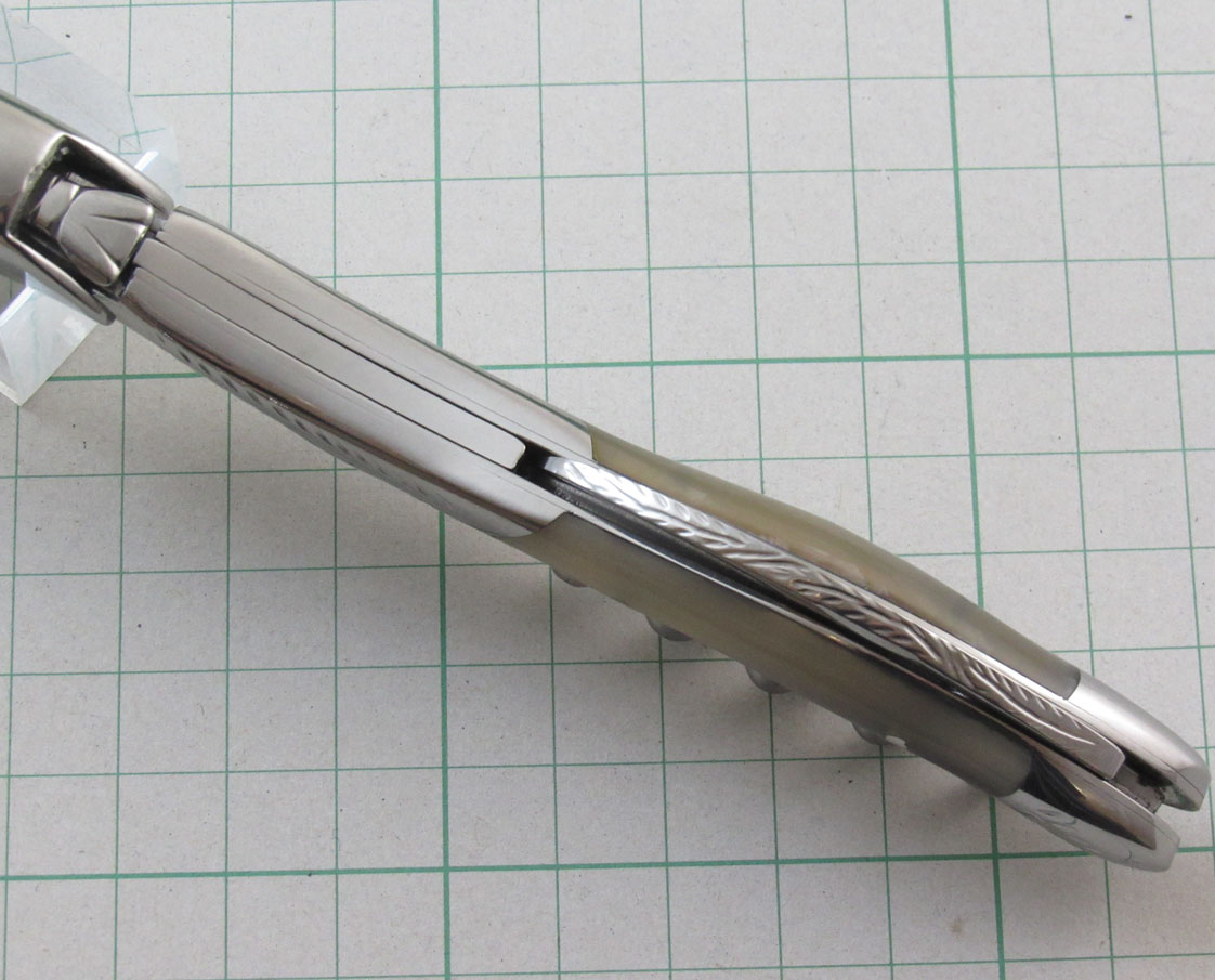 Stainless steel / Handle material – Ocrack cow’s horn length 120mm [Features] A special model with leaf pattern decorations applied to the body and foil cutter.*Includes a special wood case *Stainless steel (mirror surface processing)