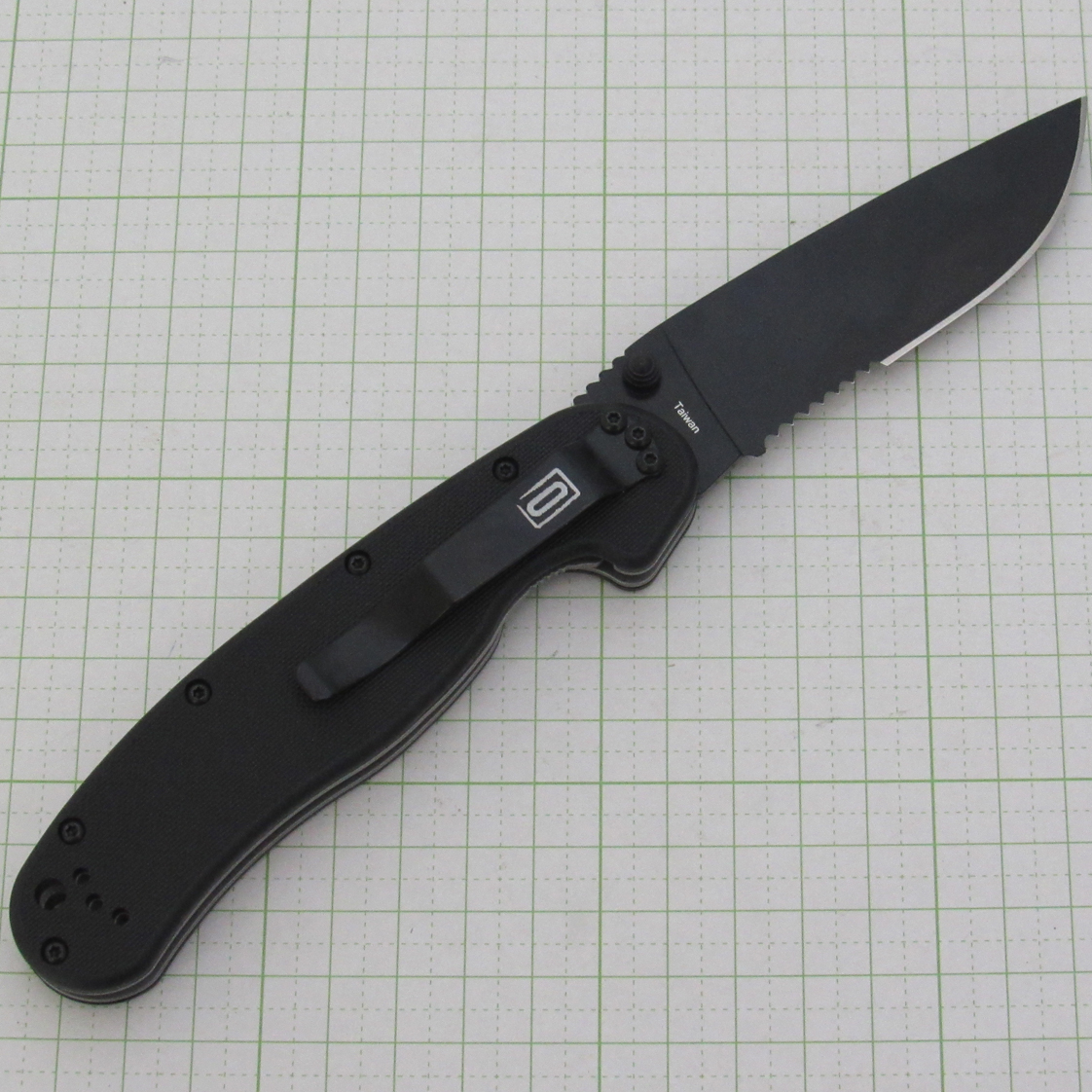 AUS-8鋼(ブラックコーティング) / ナイロン・ハンドル / ポケットクリップ(4ヶ所)刃長90mm / 柄長125mm刃厚3.0mm / 重量142g