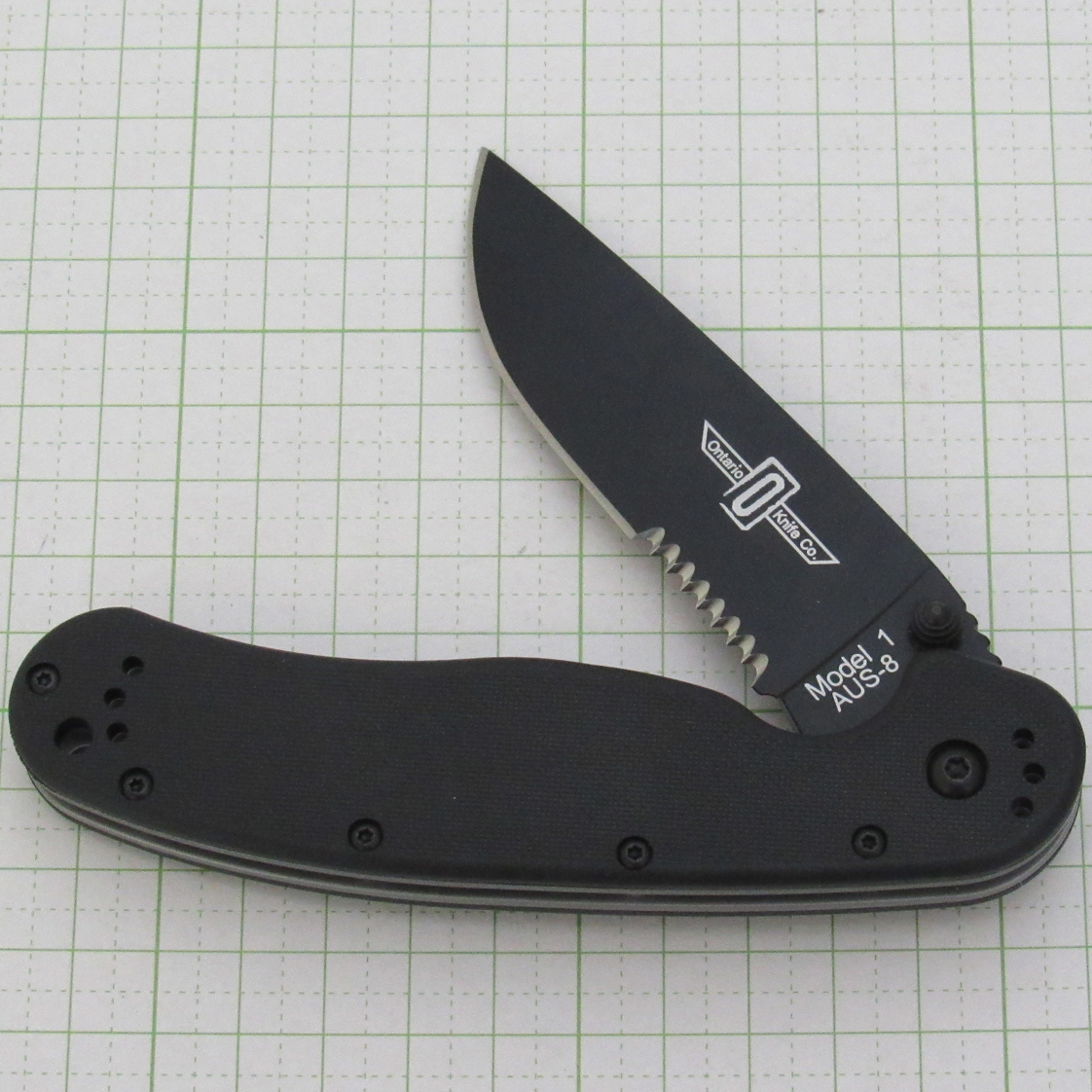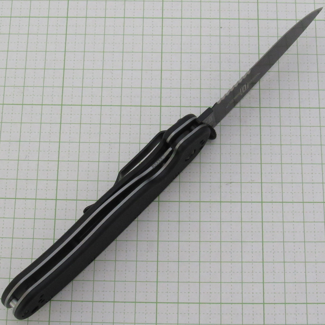 AUS-8 steel (black coating) / Nylon handle / Pocket clip (4 locations) Blade length 90mm / Handle length 125mm Blade thickness 3.0mm / Weight 142g