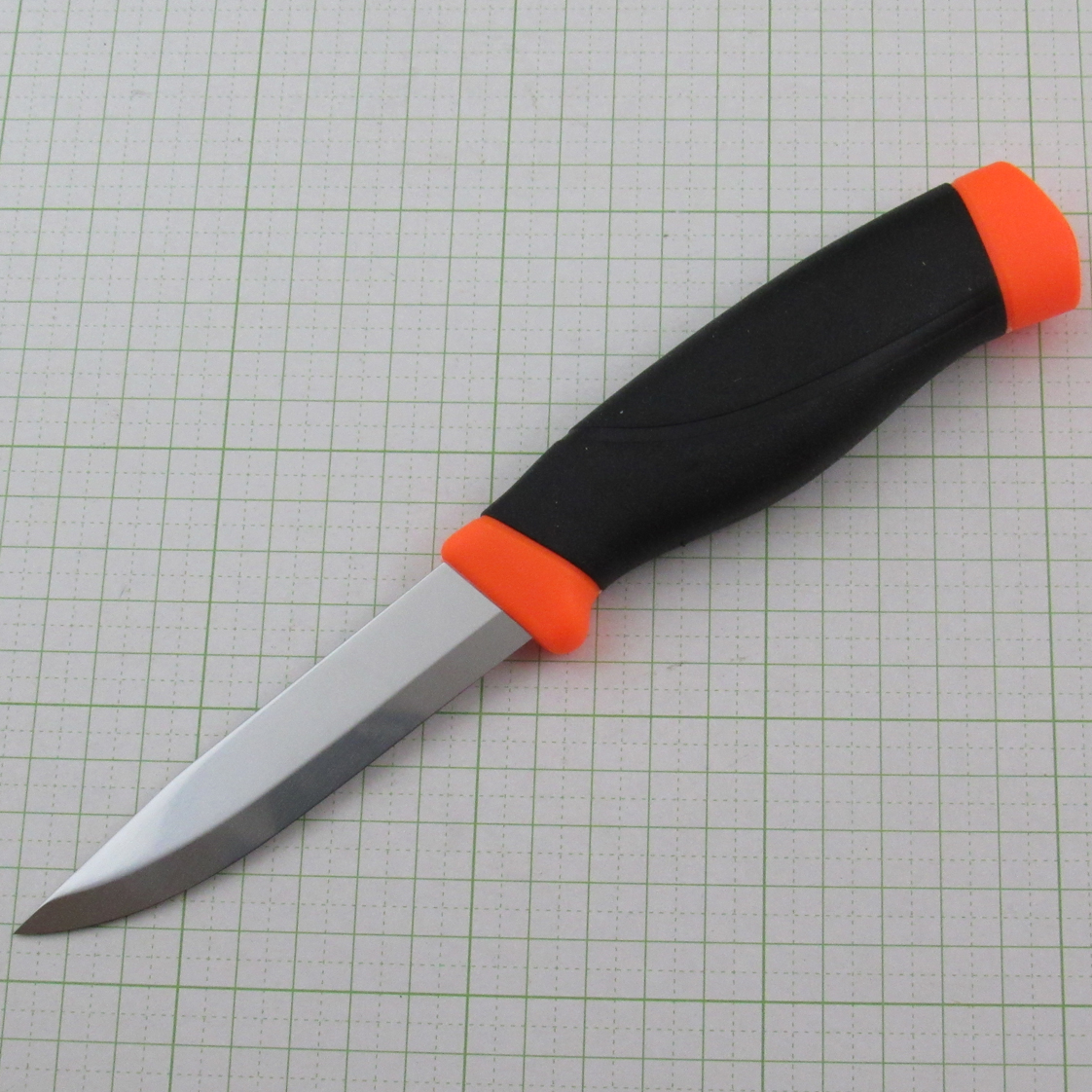 Carbon steel (Scandi grind) / Rubber trim handle / Molded resin sheath Blade length 100mm / Handle length 125mm / Blade thickness 3.2mm / Weight 100g (body only)