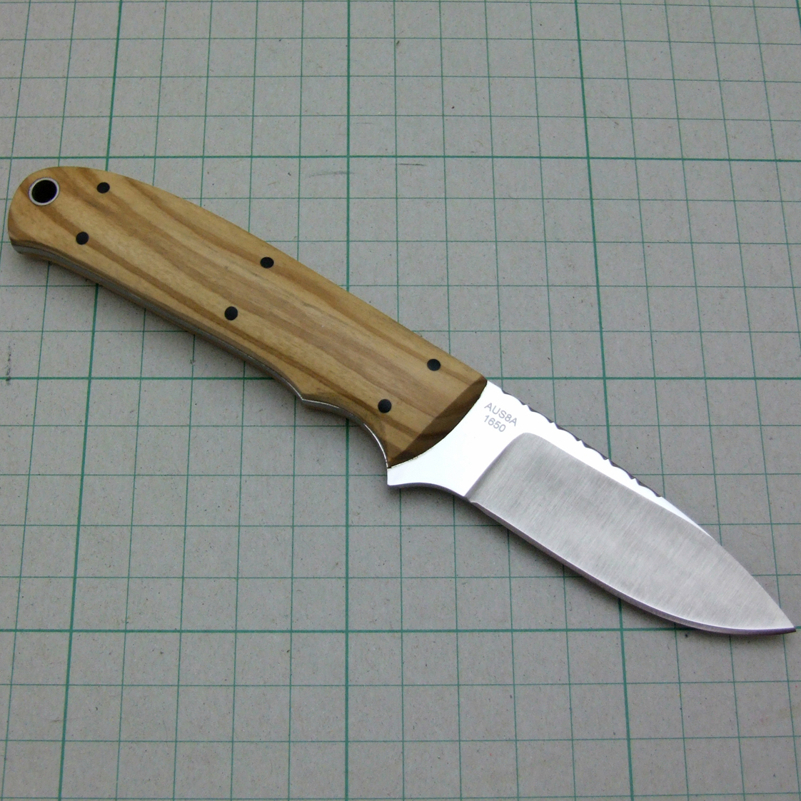 AUS-8鋼(ファイルワーク) / オリーブウッドハンドル / フルタング刃長72mm / 柄長98mm※レザーベルトシース付き