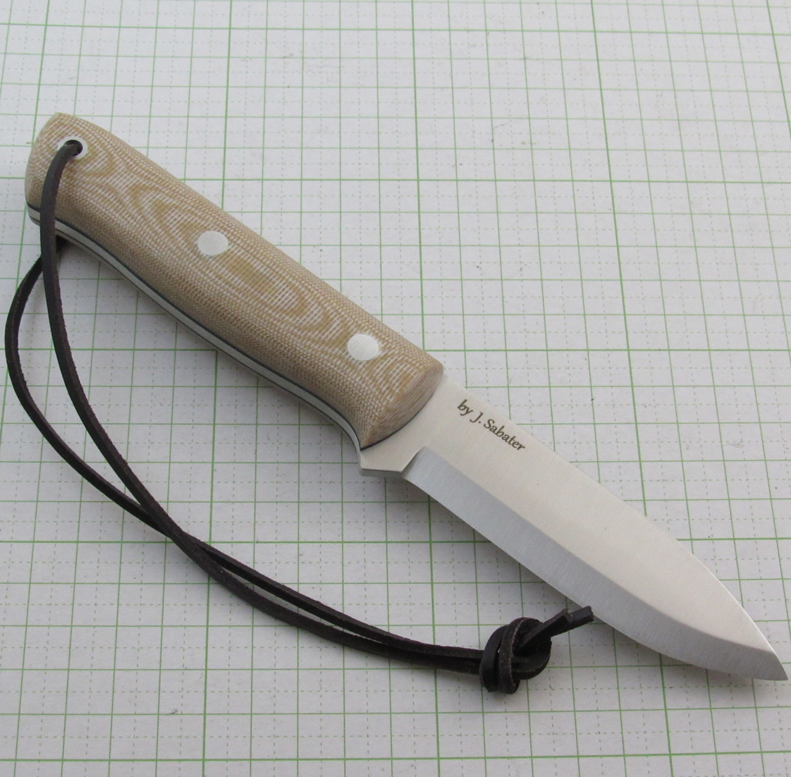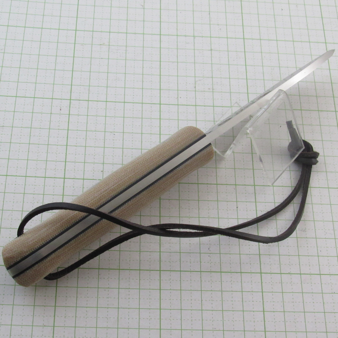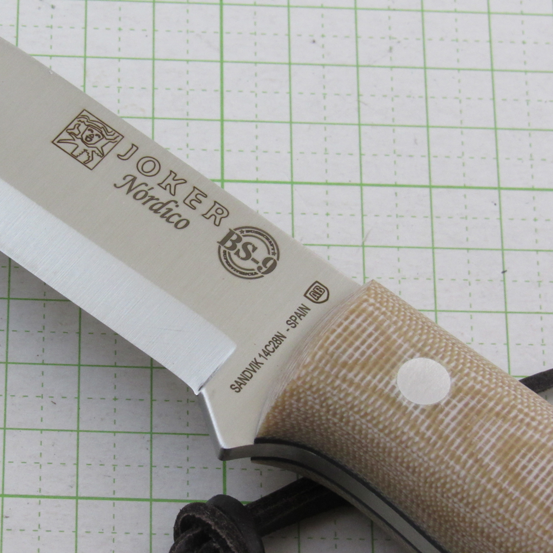 Sandvik 14C28N steel (saten finish) / Canvas Micarta handle blade length 101mm / Handle length 118mm Blade thickness 3.8mm / Weight 200g (main unit only) *Special leather sheath / with fire starter / Scandinbow ground