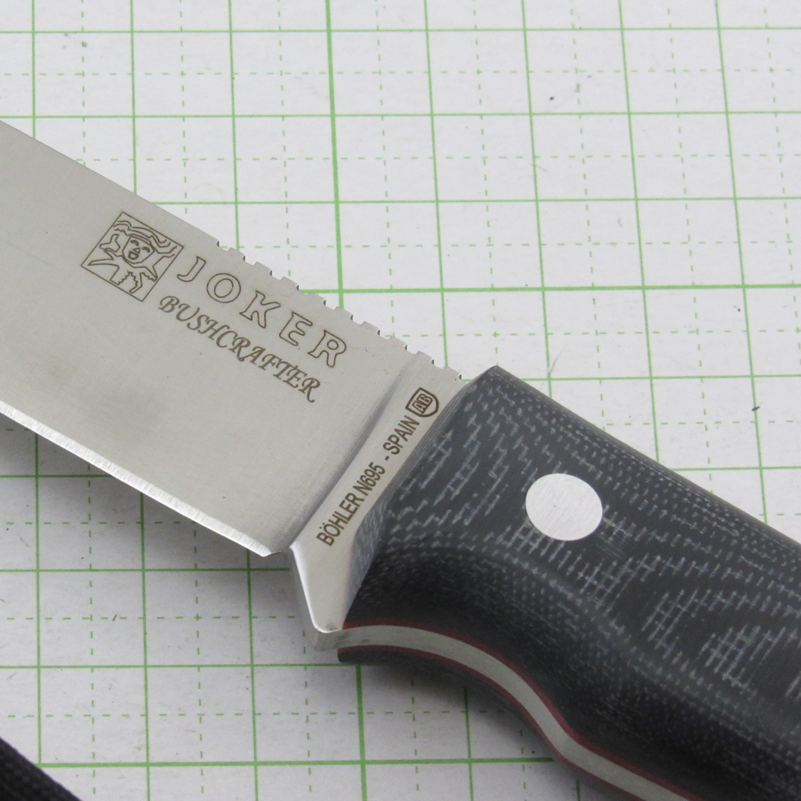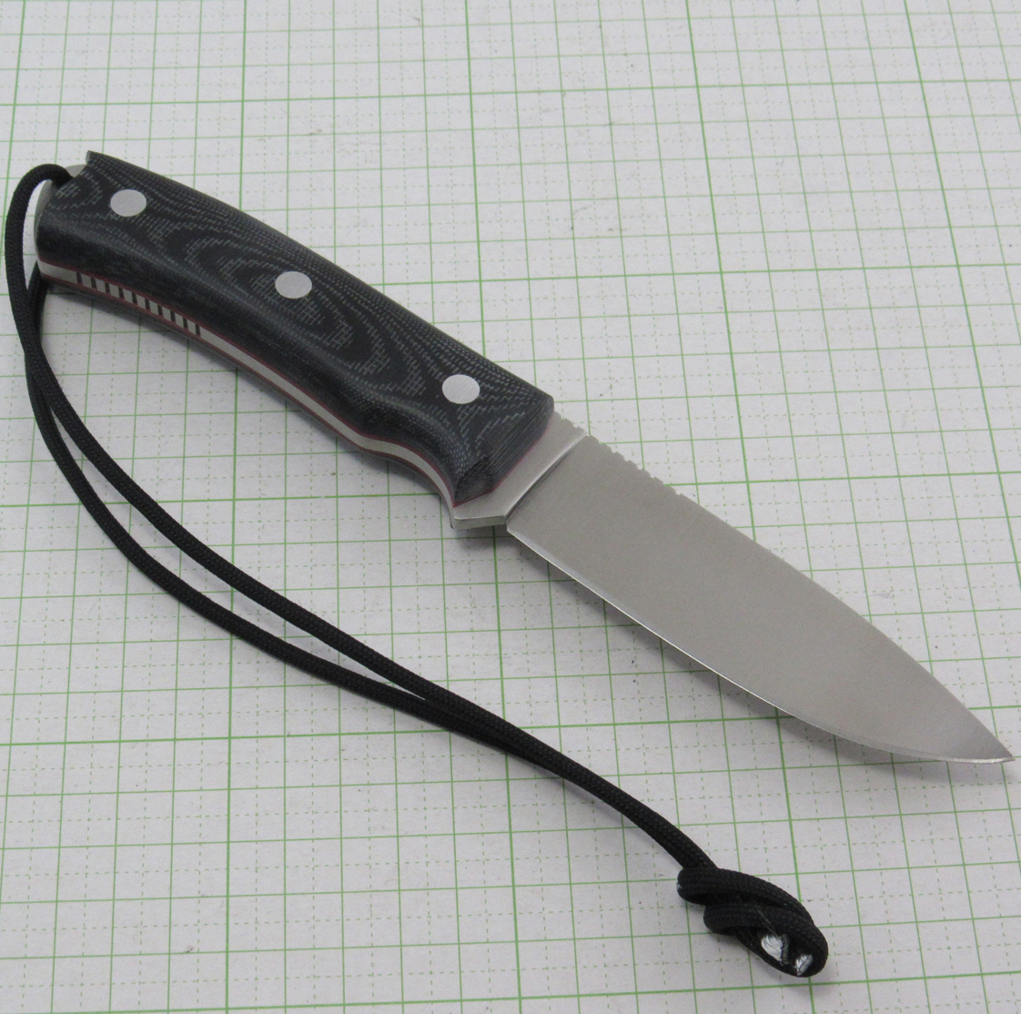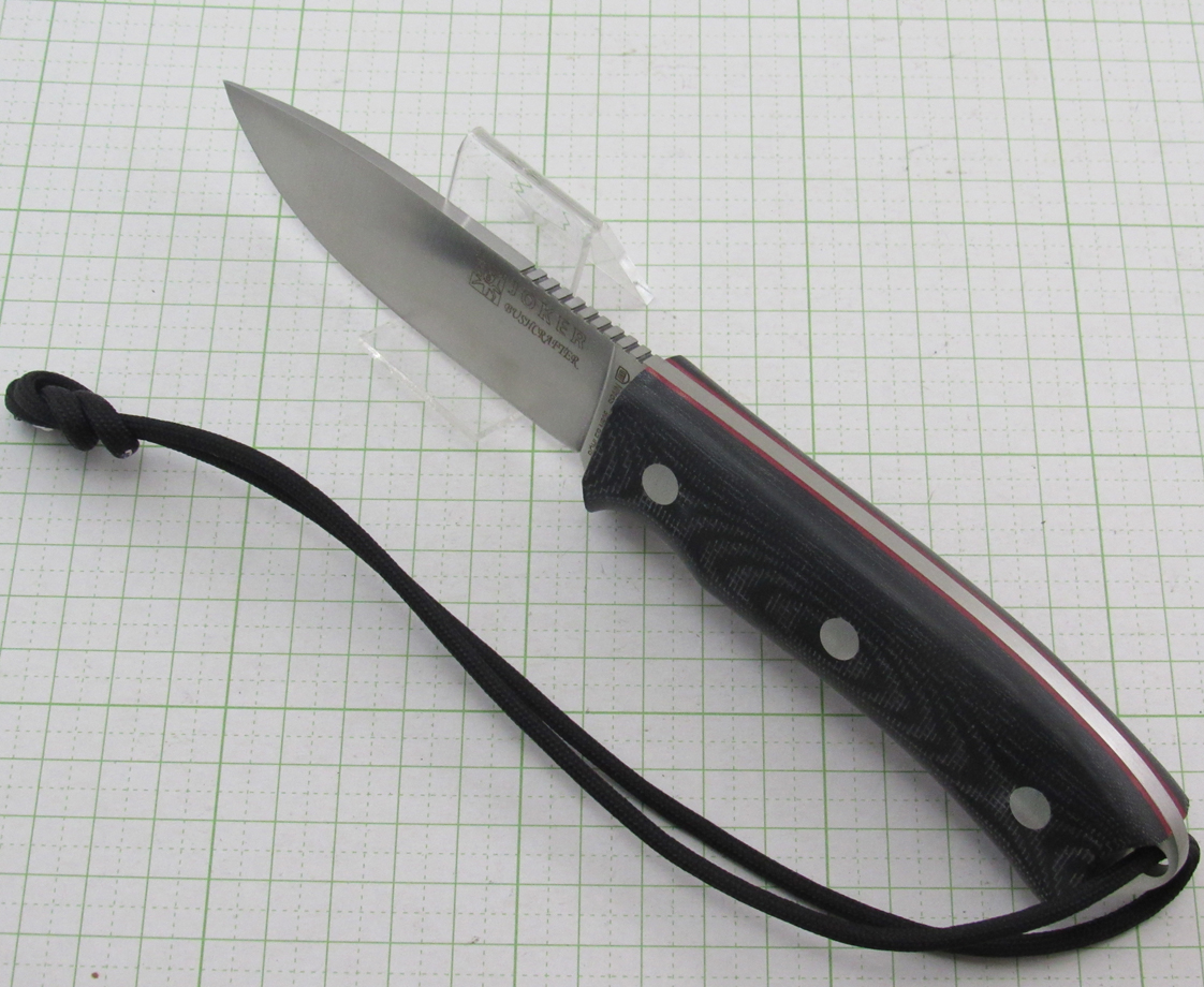 N695 steel (saten finish) / Canvas Micarta handle blade length 105mm / Handle length 118mm Blade thickness 3.9mm / Weight 185g (main unit only) *Special leather sheath / with fire starter / V-flat grind
