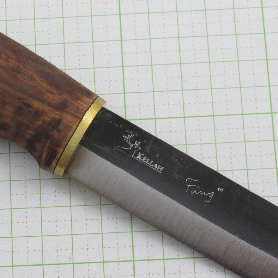 カーボン鋼(スカンジグラインド) / カーリーバーチハンドル / 革シース刃長120mm / 柄長120mm / 刃厚3.2mm / 重量150g(本体のみ)