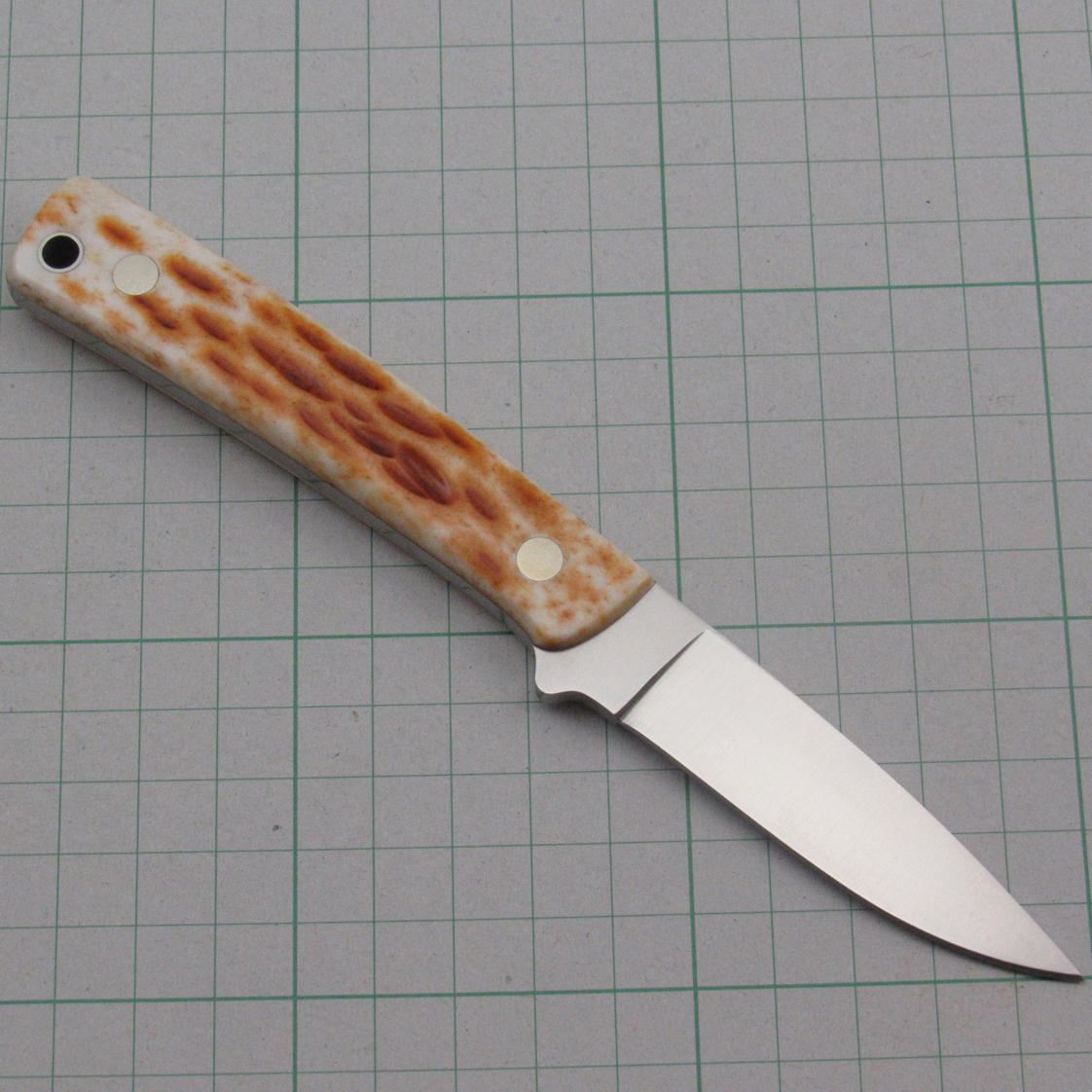 VG10 steel (flat grind) / Jigged bone handle / Leather sheath blade length 75mm / Handle length 97mm / Blade thickness 3.5mm / Weight 80g (main unit only)