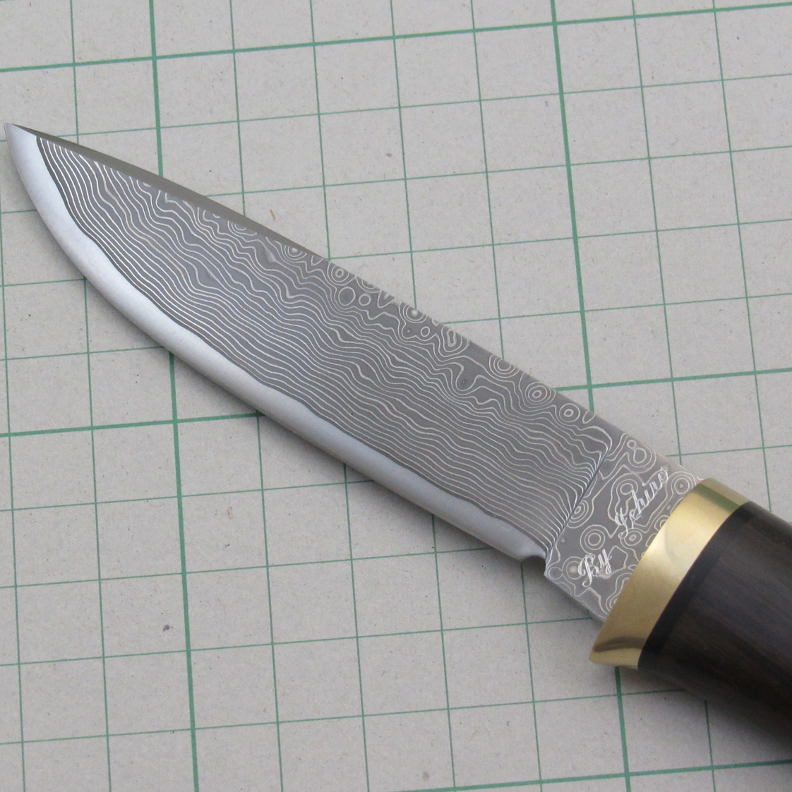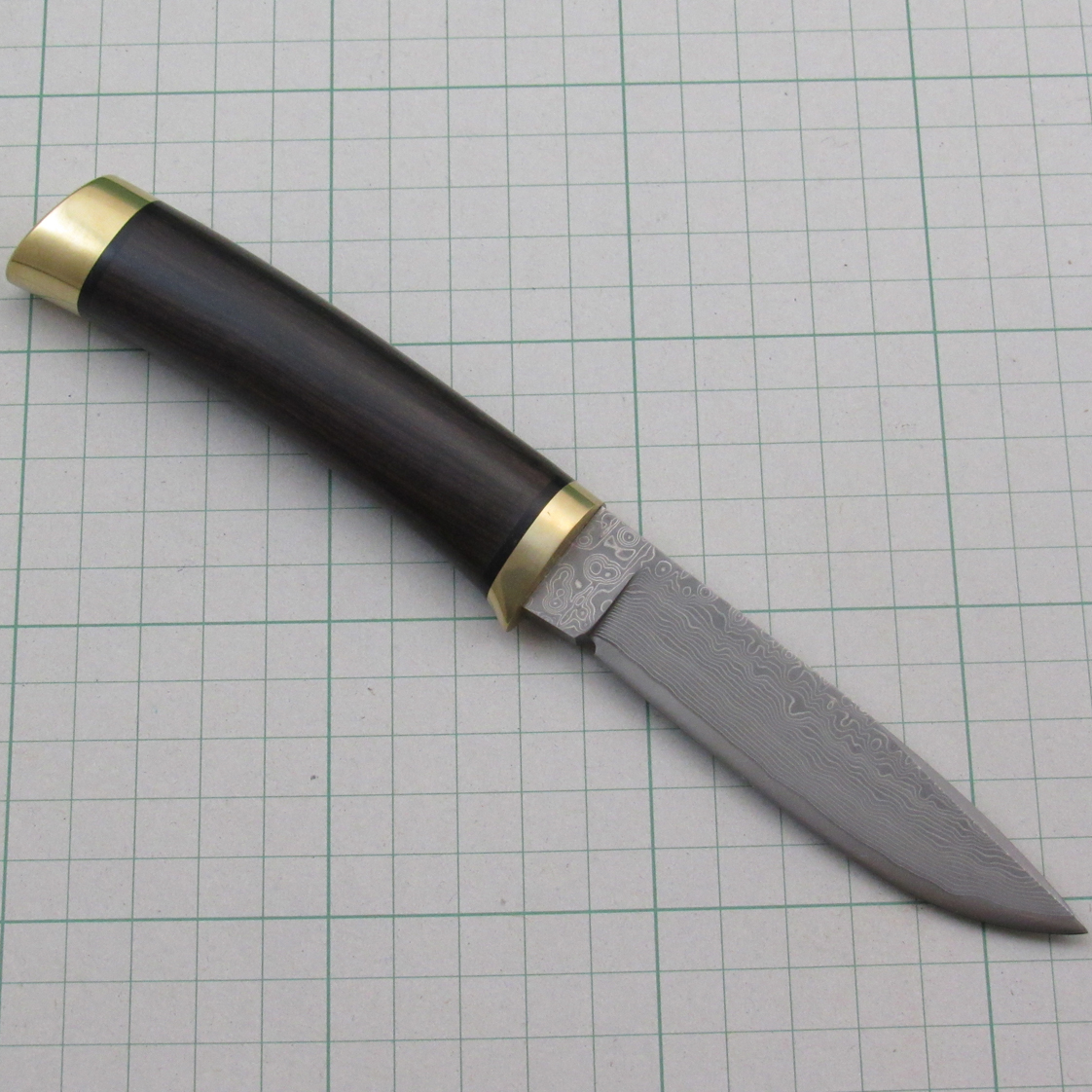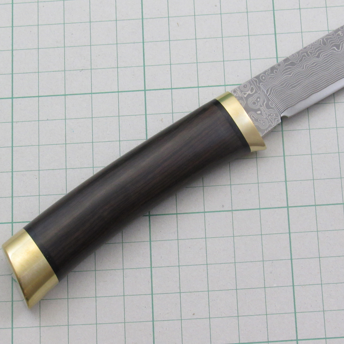 カウリX鋼(ニッケルステンダマスカス) / エボニーハンドル(黒檀) / レザーシース刃長100mm / 柄長103m / 刃厚5.0mm / 重量140g(本体のみ)