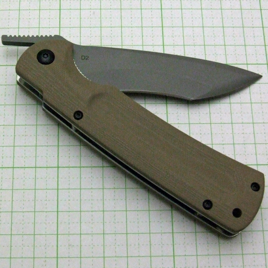 D-2 layer (blast) / G-10 / Handle (olive) / Liner lock blade length 95mm / Handle length 122mm / Blade thickness 3.8mm / Weight 160g