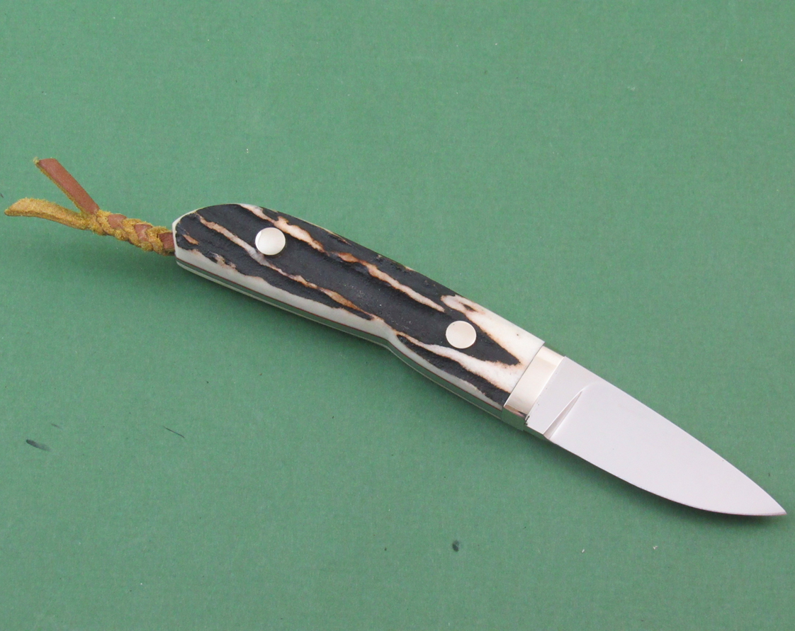 ATS-34鋼(ミラー仕上げ) / サンバースタッグハンドル / ニッケルシルバーヒルト刃長52mm / 柄長85mm / 刃厚3.0mm / 重量60g