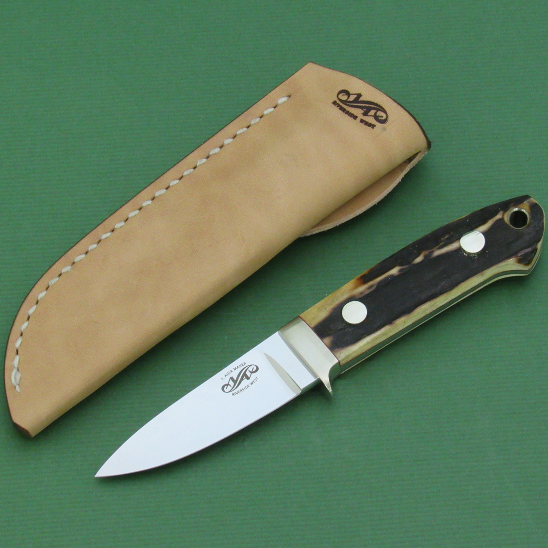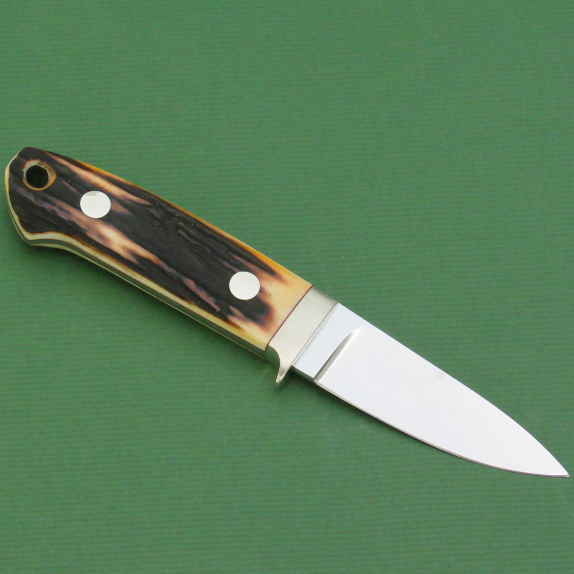 ATS-34 steel (mirror finish) / Amber stag handle / Nickel silver hilt / Red spacer blade length 75mm / Handle length 95mm / Blade thickness 4.0mm / Weight 113g