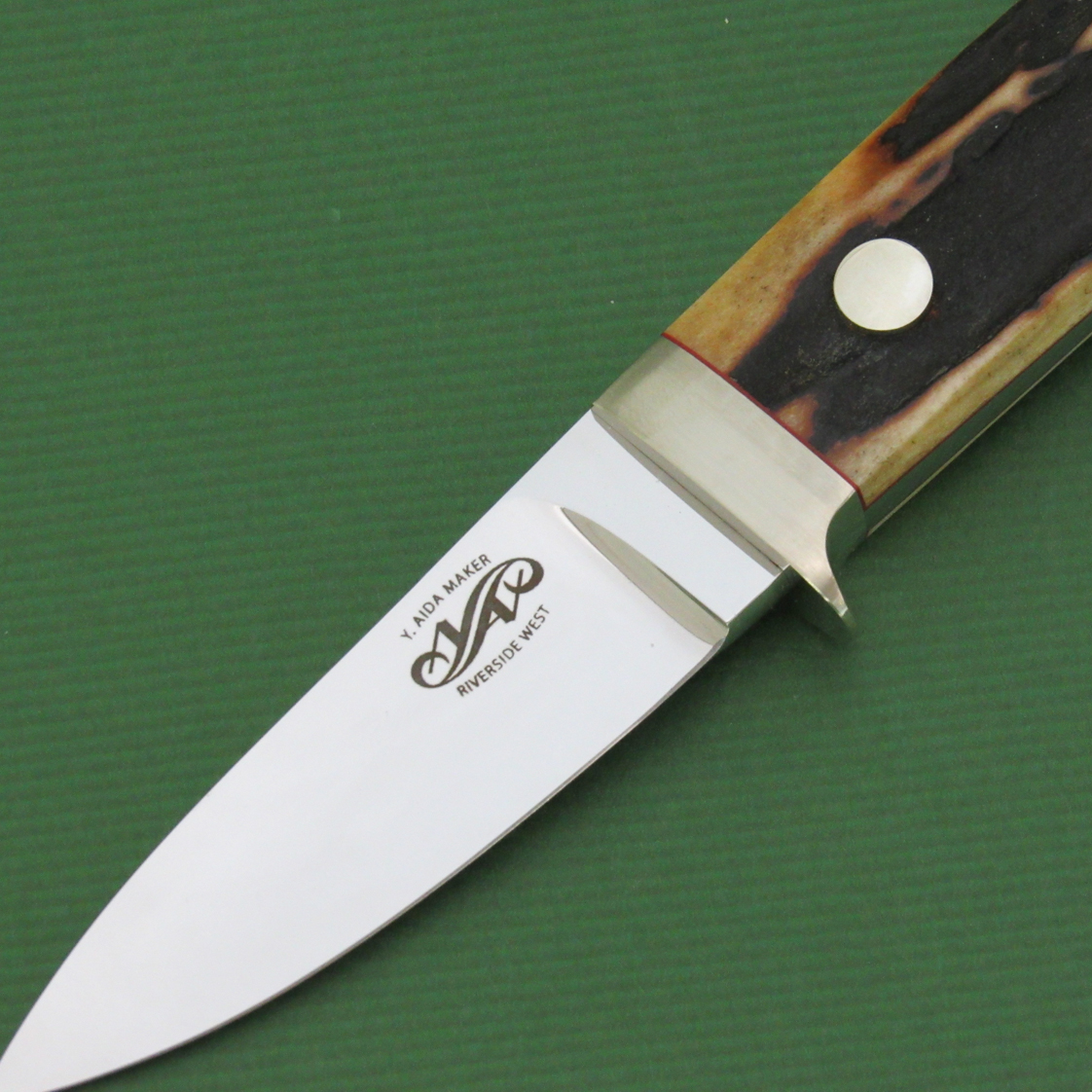 ATS-34鋼(ミラー仕上げ) / アンバースタッグハンドル /ニッケルシルバー・ヒルト / レッドスペーサー刃長75mm / 柄長95mm / 刃厚4.0mm / 重量113g