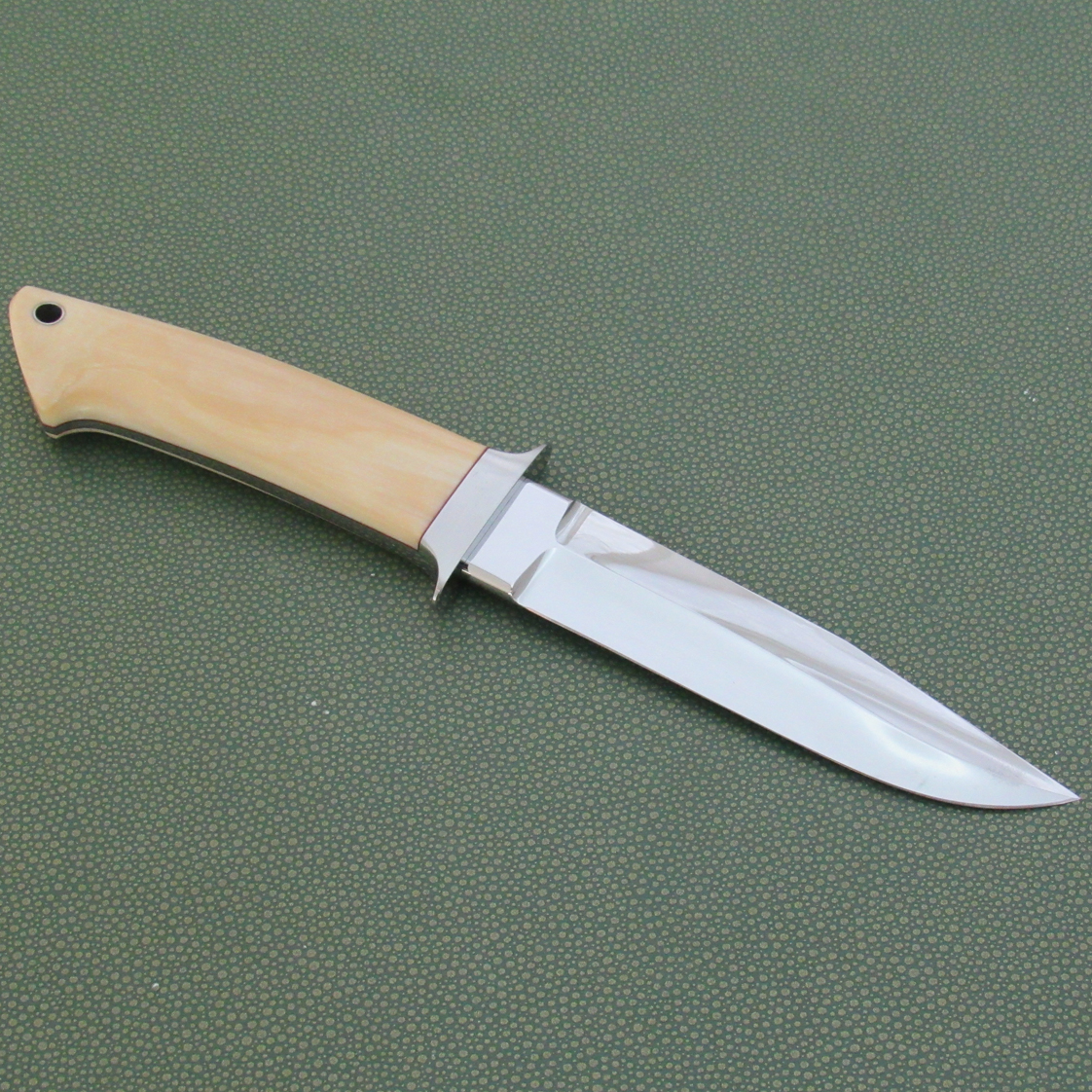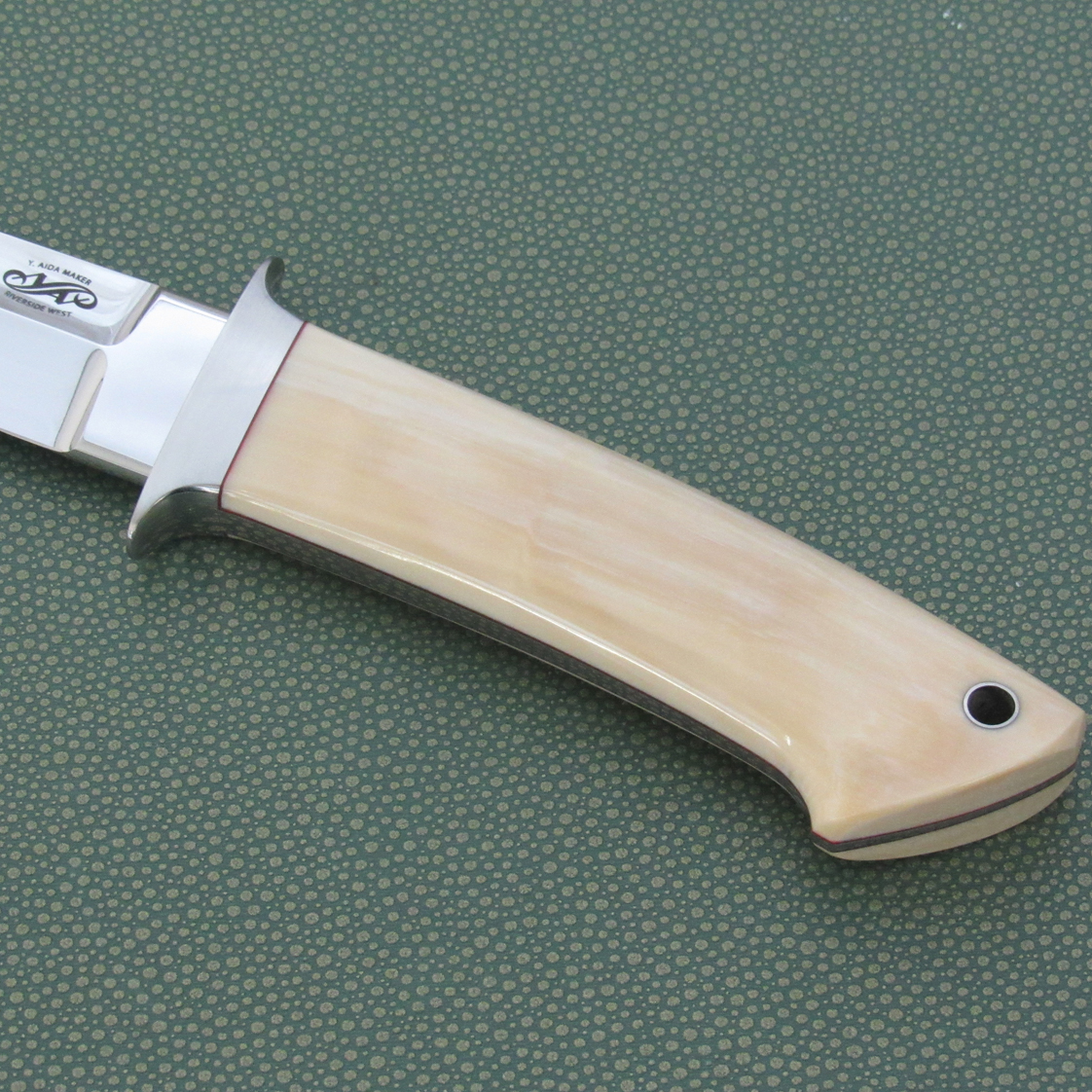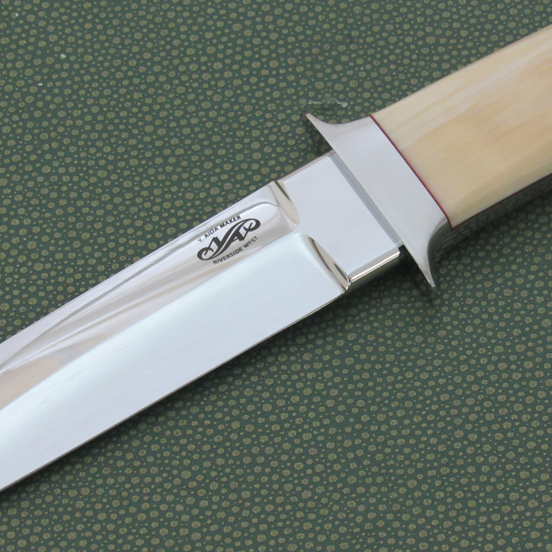 ATS-34鋼(ミラー仕上げ) / マンモスアイボリー(牙) / ステンレスダブルガード /ヒドウンボルト(隠しボルト) / レッドスペーサー刃長138mm / 柄長125mm / 刃厚6.0mm / 重量290g