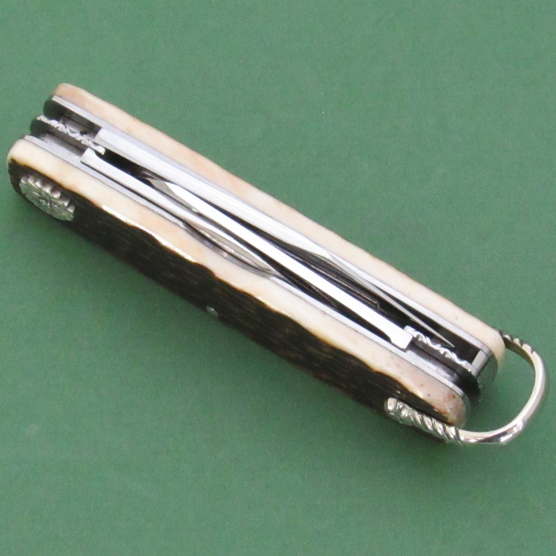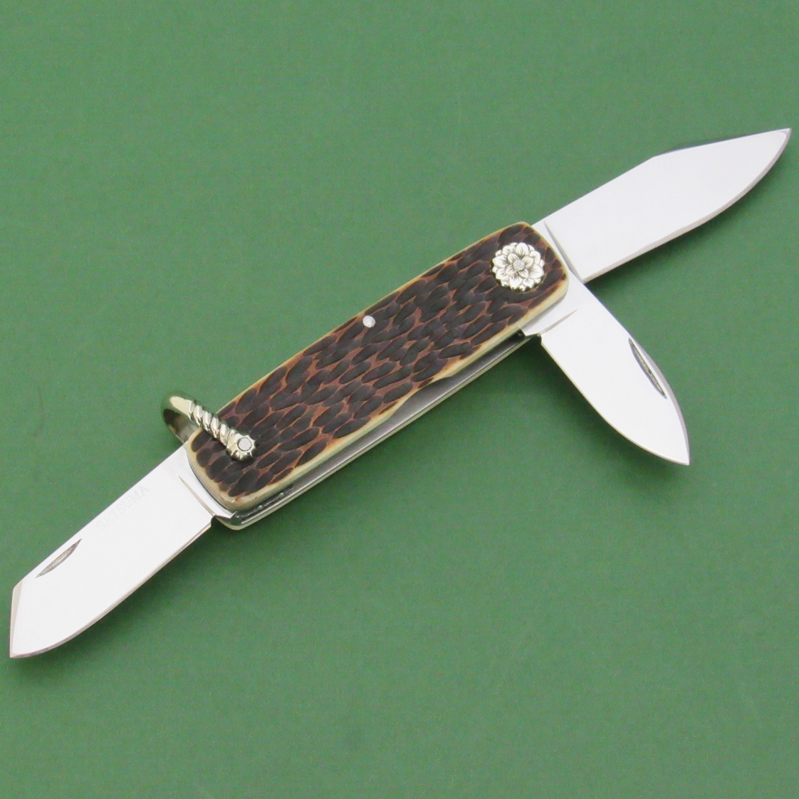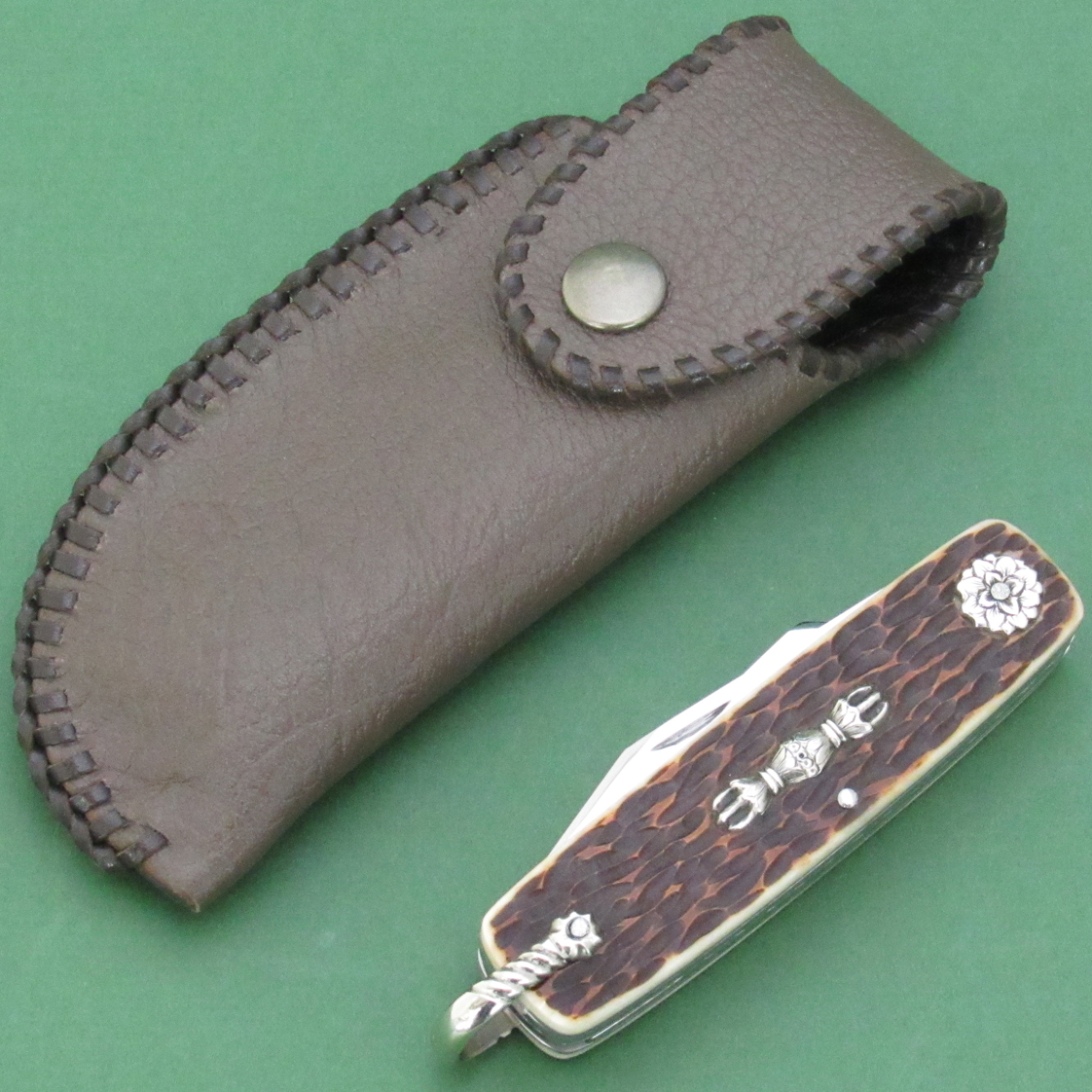 VG-10 steel (mirror finish) / Jig bone handle / Silver spacer & Sanko pestle / Silver round ring / Silver rivet Blade length 60mm, 47mm, 41mm / Handle length 82mm / Blade thickness 2.7mm / Weight 100g