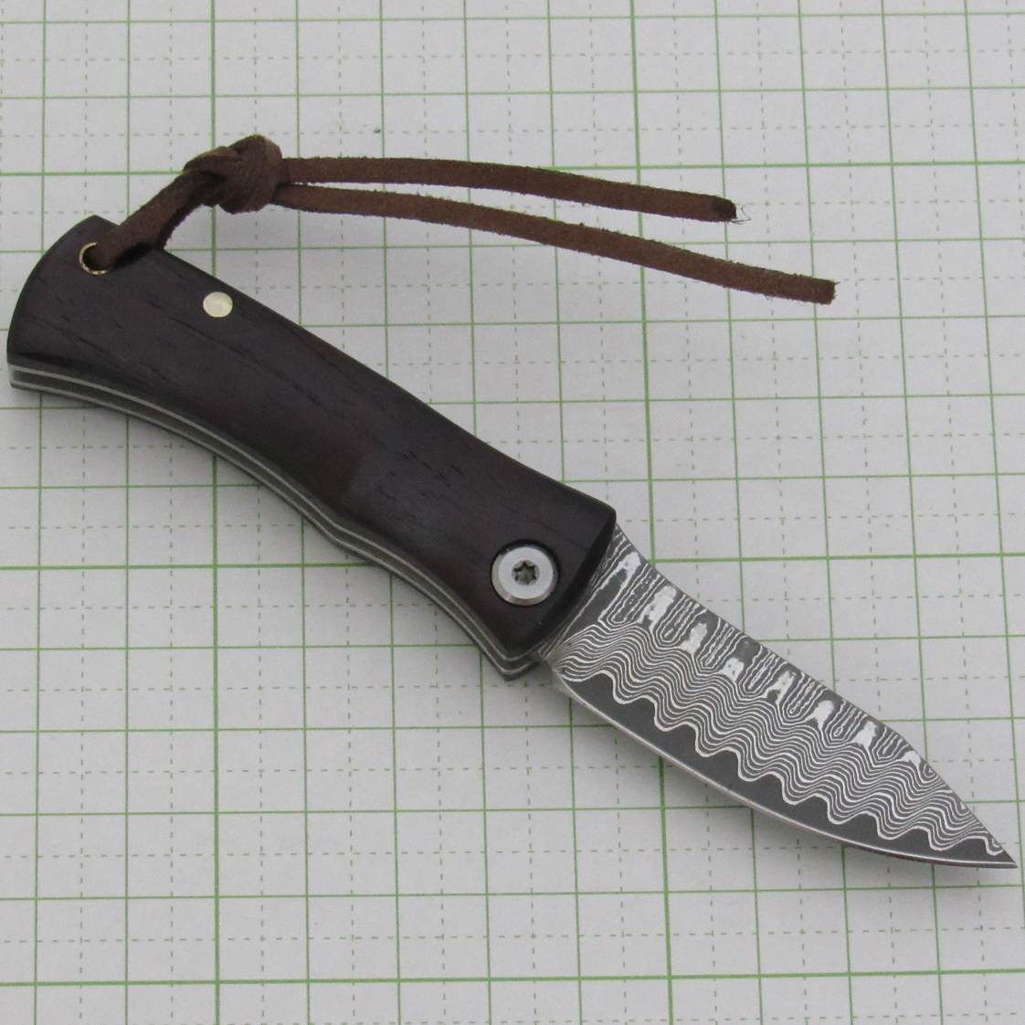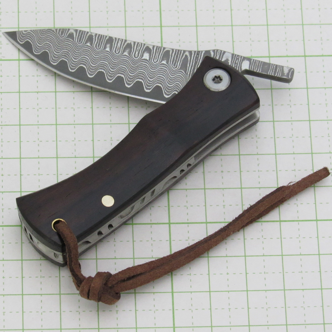 8CR鋼割込ダマスカス / ココボロウッドハンドル刃長57mm / 柄長74mm / 刃厚2.3mm / 重量60g※ロックなし