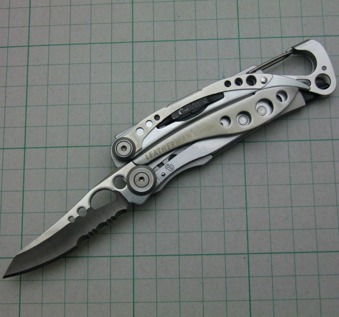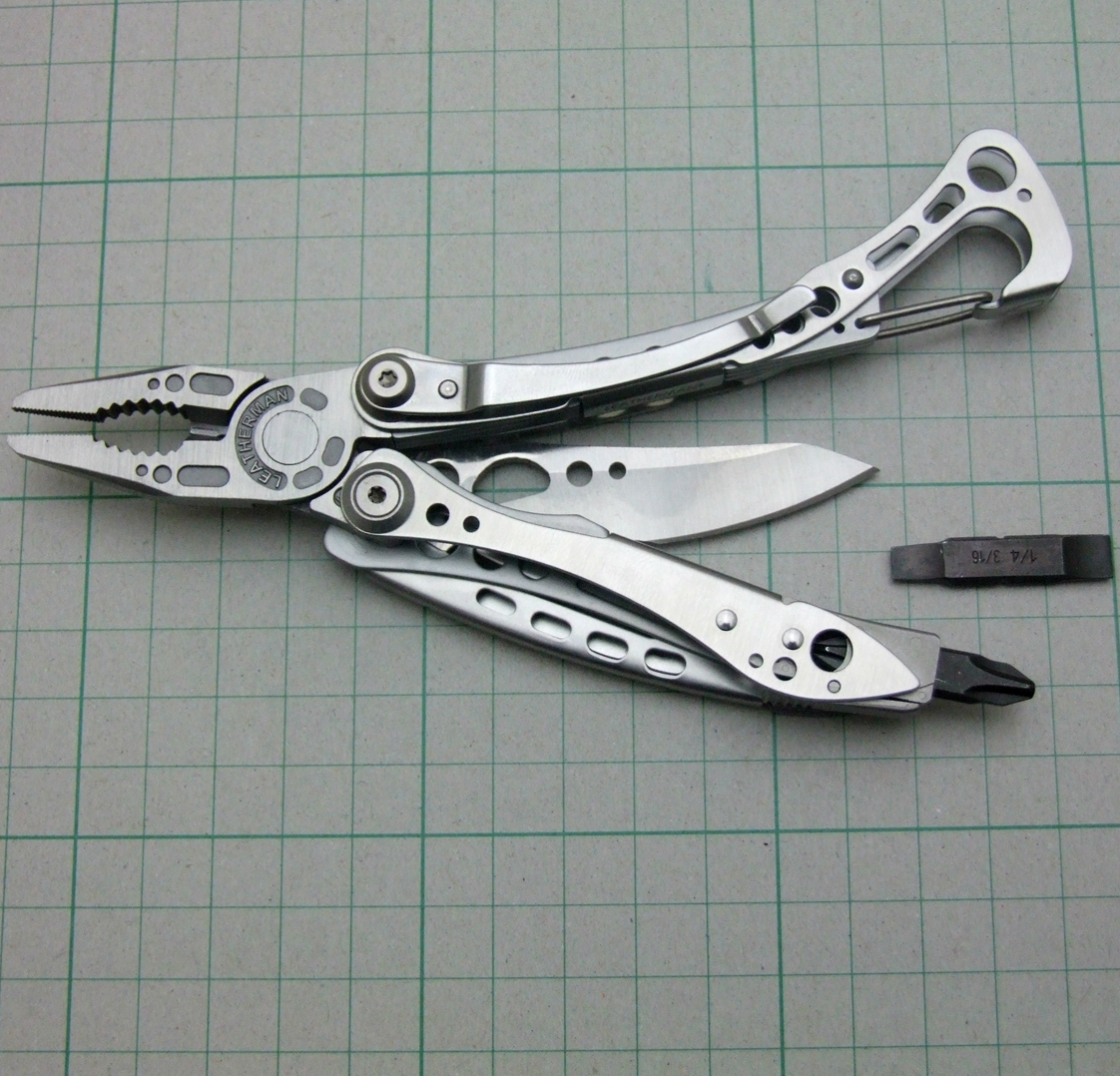 Inner flathead screwdriver / Phillips screwdriver / Carabiner / Bottle opener / Pocket clip