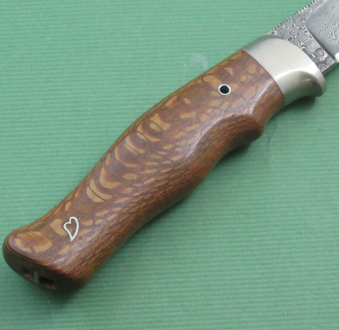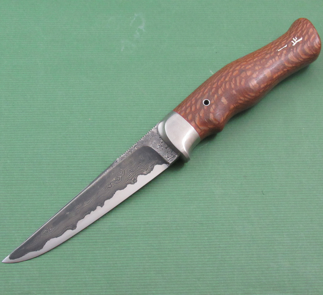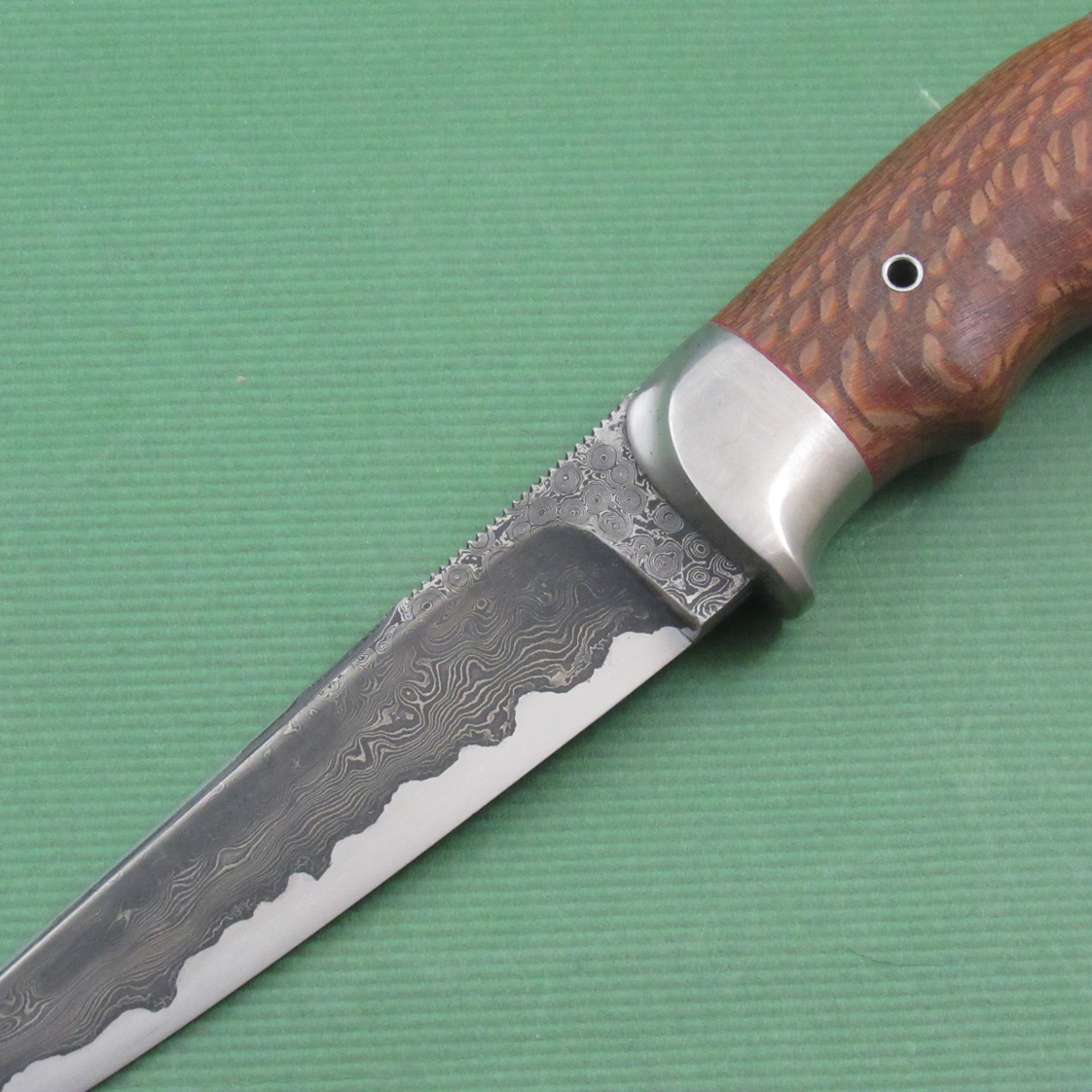 ボーラK990鋼割込み(ニッケルダマスカス) / レースウッドハンドル刃渡113mm /柄長120mm / 刃厚3.8mm / 重量105g(本体のみ)※ガードヒルトにニッケルシルバーを使用※専用レザーシース