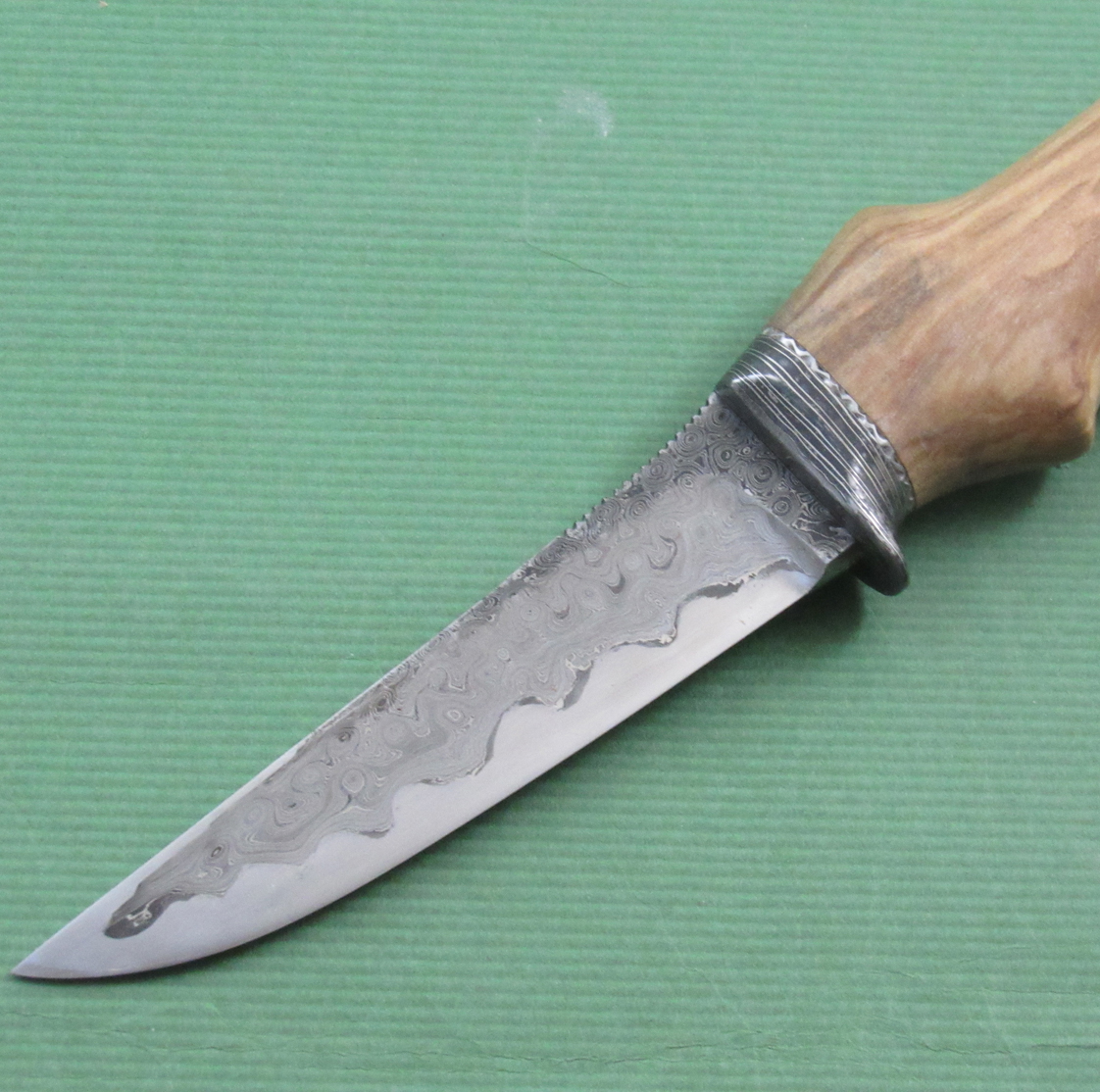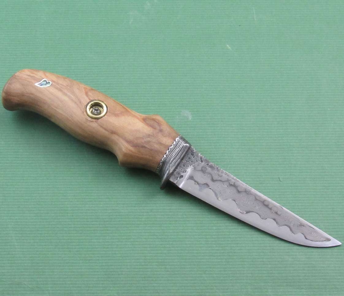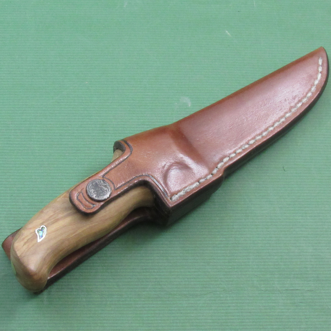 ボーラK990鋼割込み(ニッケルダマスカス) / オリーブウッドハンドル刃渡90mm /柄長98mm / 刃厚4.2mm / 重量100g(本体のみ)※ガードヒルトにニッケルダマスカスを使用※ハートマークにアバロンをインレイ※専用レザーシースはハンドル材にボタン止付