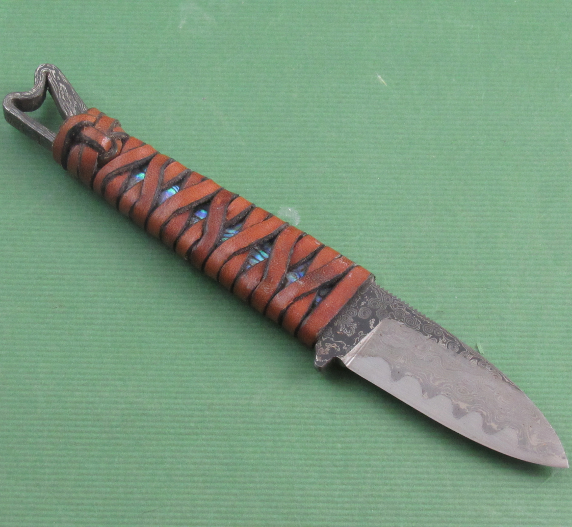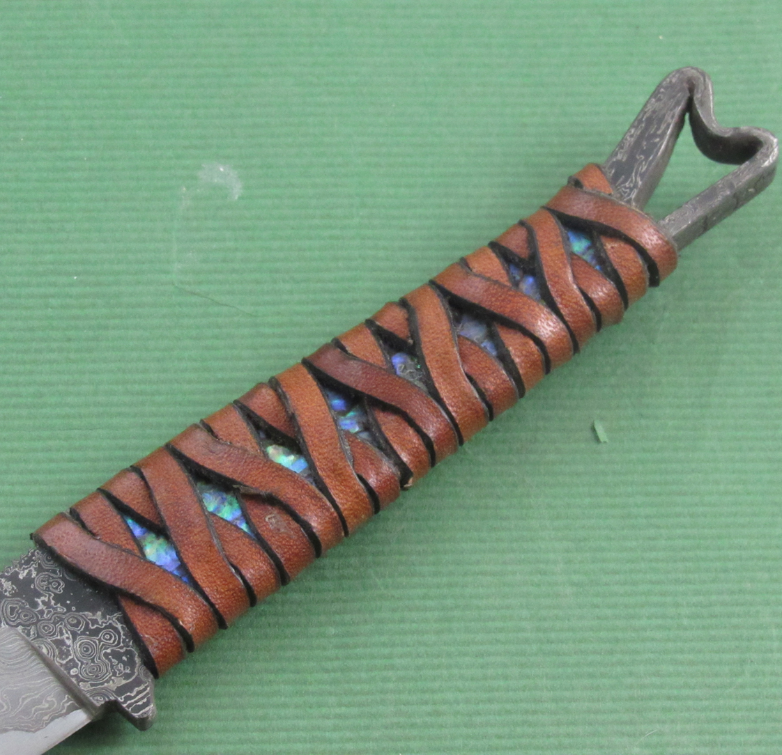 武生V1号多層鋼 / 皮巻き柄 / アバロン(鮑貝)プレート刃渡62mm /全長175mm / 刃厚3.6mm / 重量90g(本体のみ)※専用レザーシース付き
