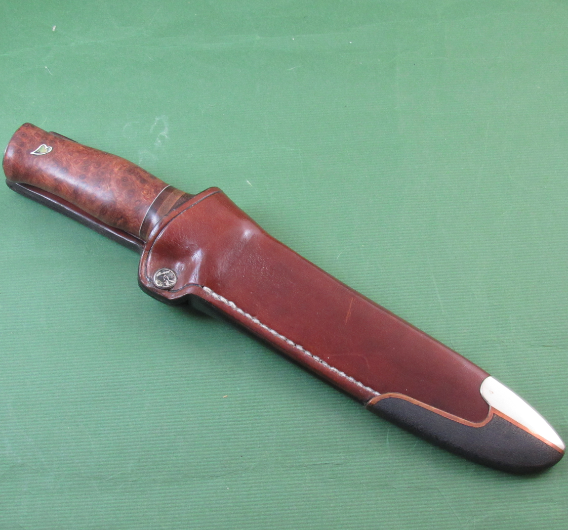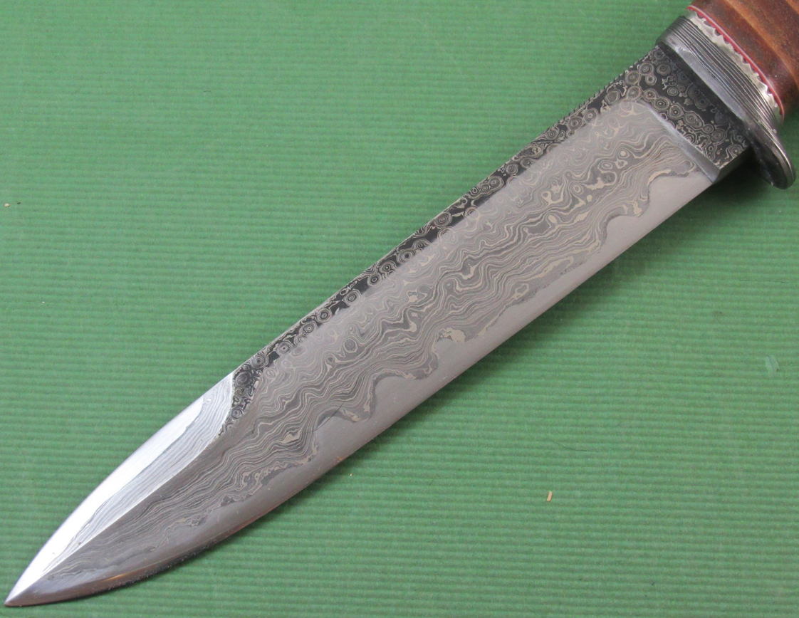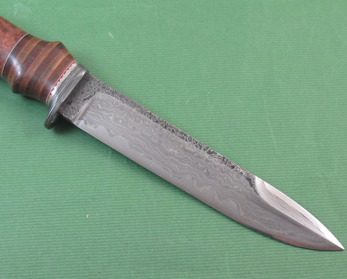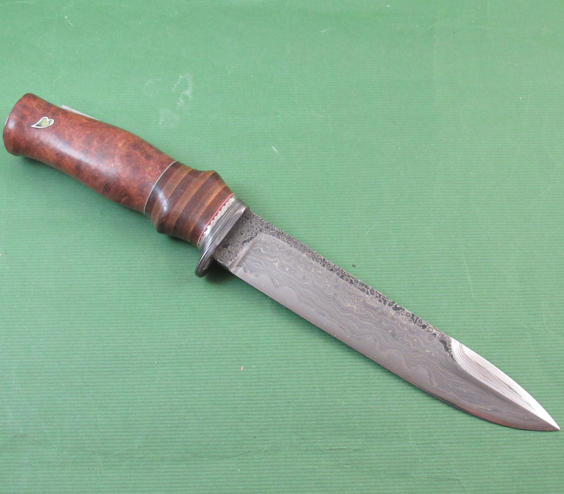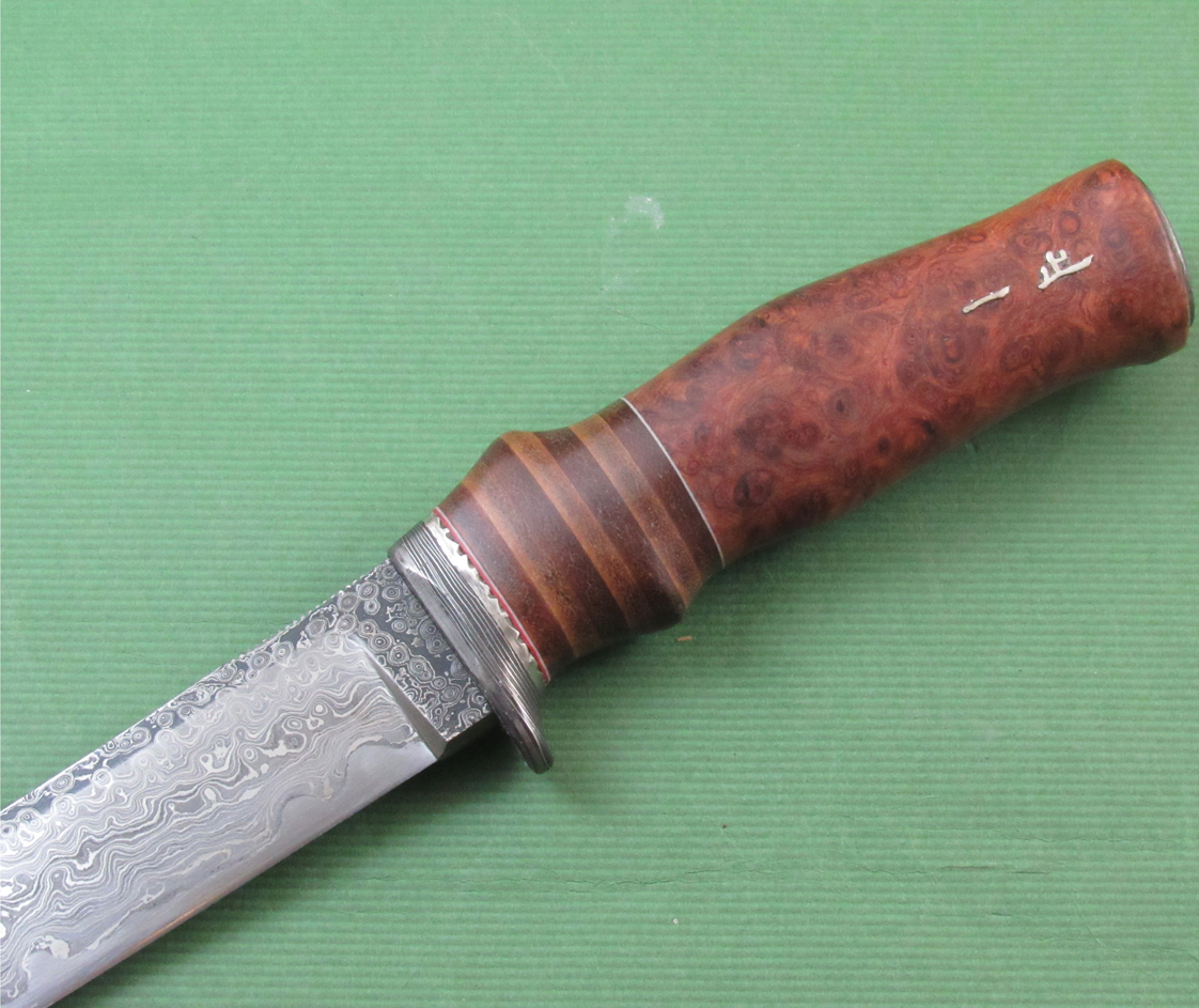 ボーラK990鋼割込み(ニッケルダマスカス) / 花梨の瘤&レザーハンドル刃渡163mm /柄長120mm / 刃厚5.4mm / 重量250g(本体のみ)※地金に和鉄でニッケルダマスカスを錬金造り。※ハンドル材には花梨木の根瘤&レザーワッシャを採用。※ガードヒルトとバッドプレートにもニッケルダマスカスを使用※専用レザーシース(先端に虫喰ブラック&ブロンズ仕上)