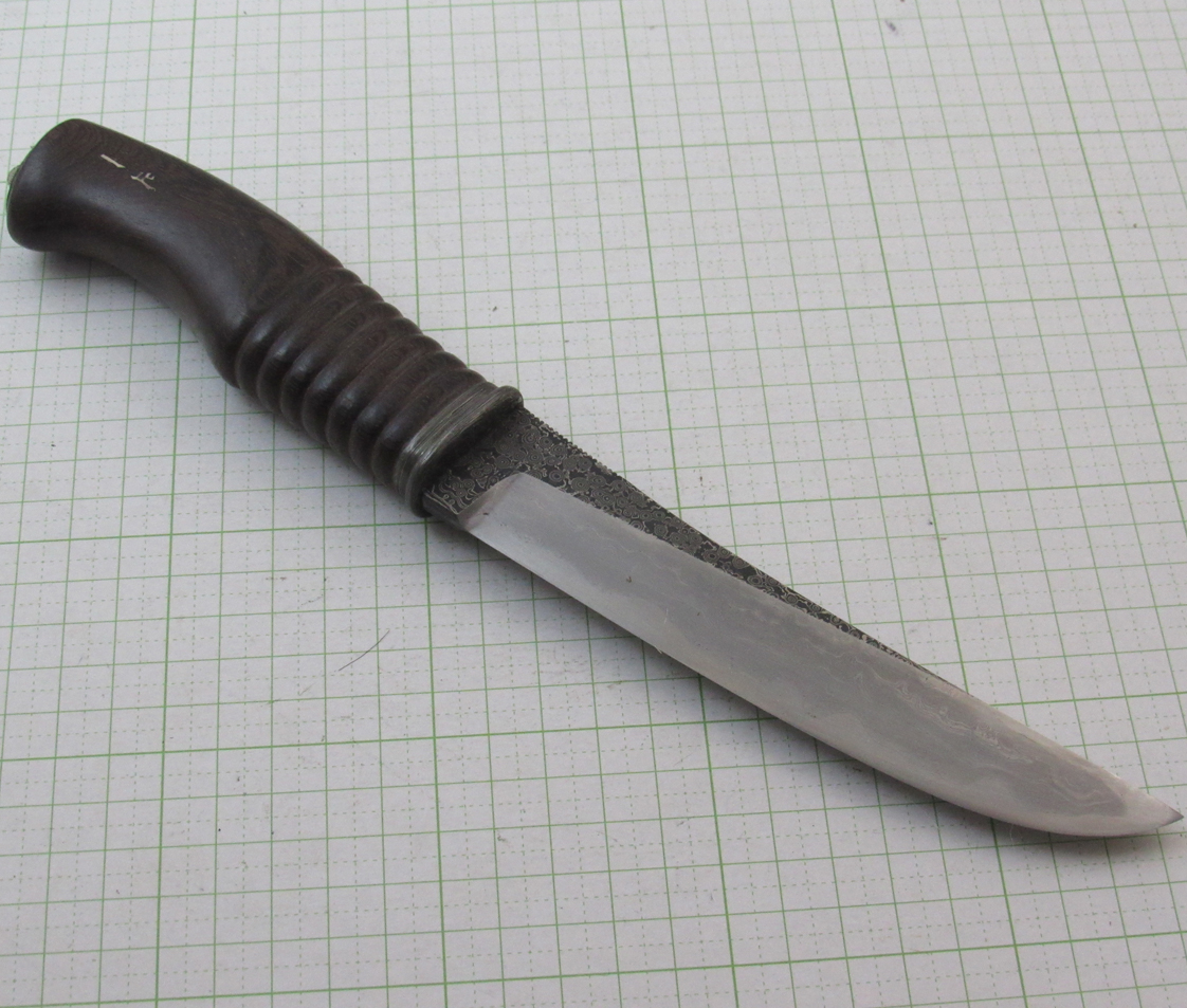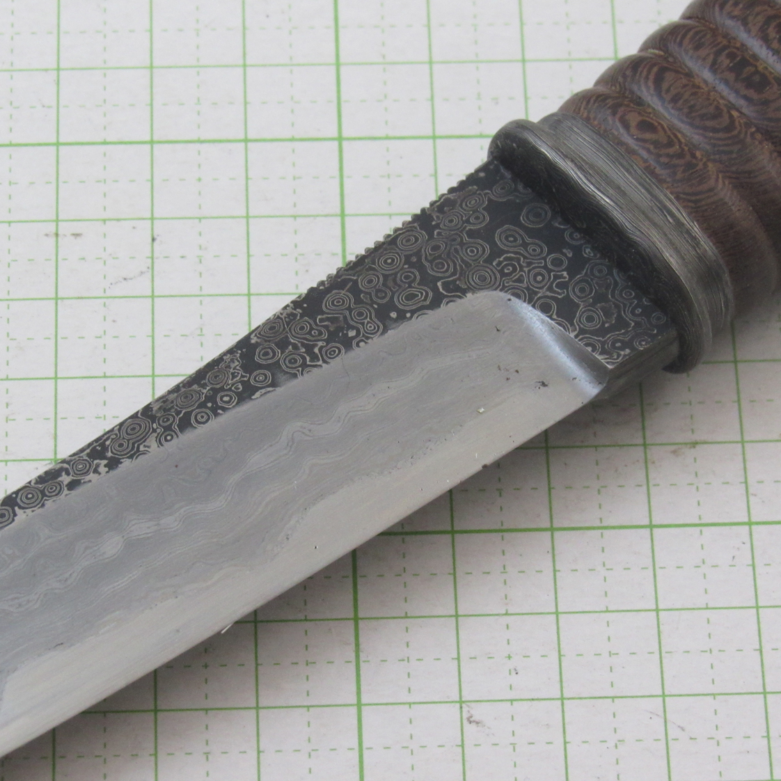 ボーラK990鋼割込み(ニッケルダマスカス) / タガヤサン柄 /ヒルト(ニッケルシルバーダマスカス)刃渡150mm /柄長123mm / 刃厚5.3mm / 重量230g(本体のみ)※専用レザーシース(ナスカン付)