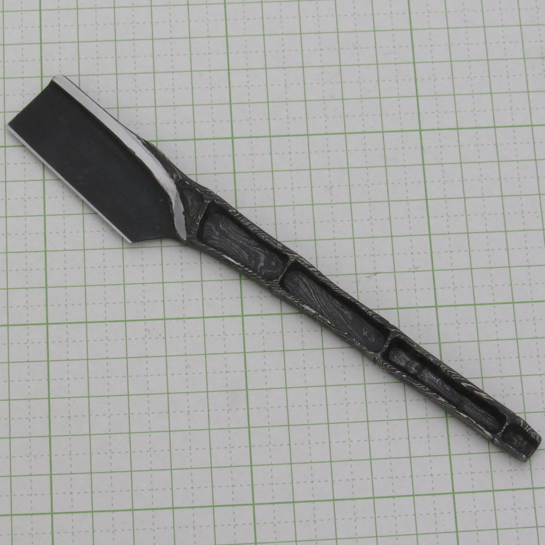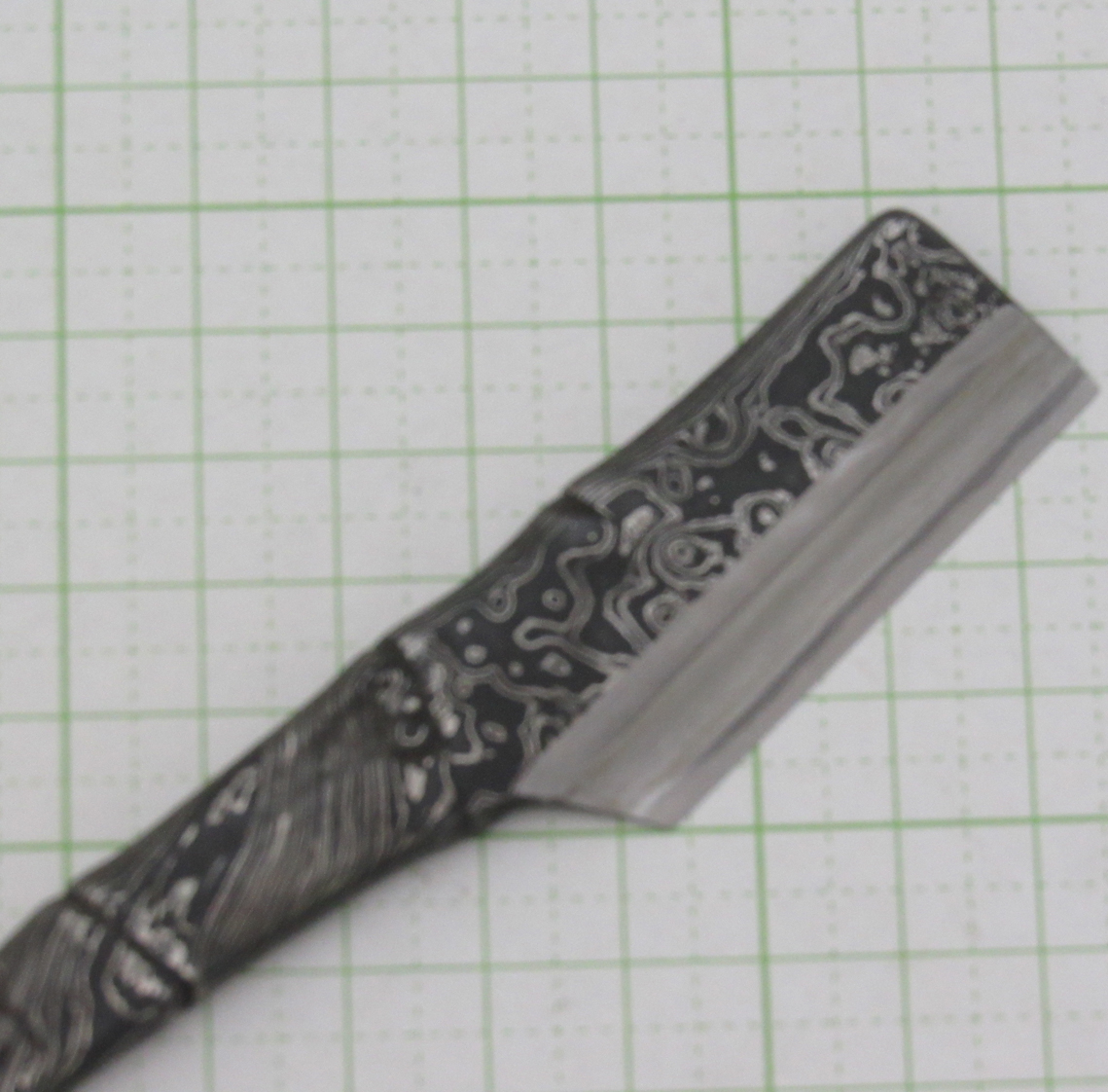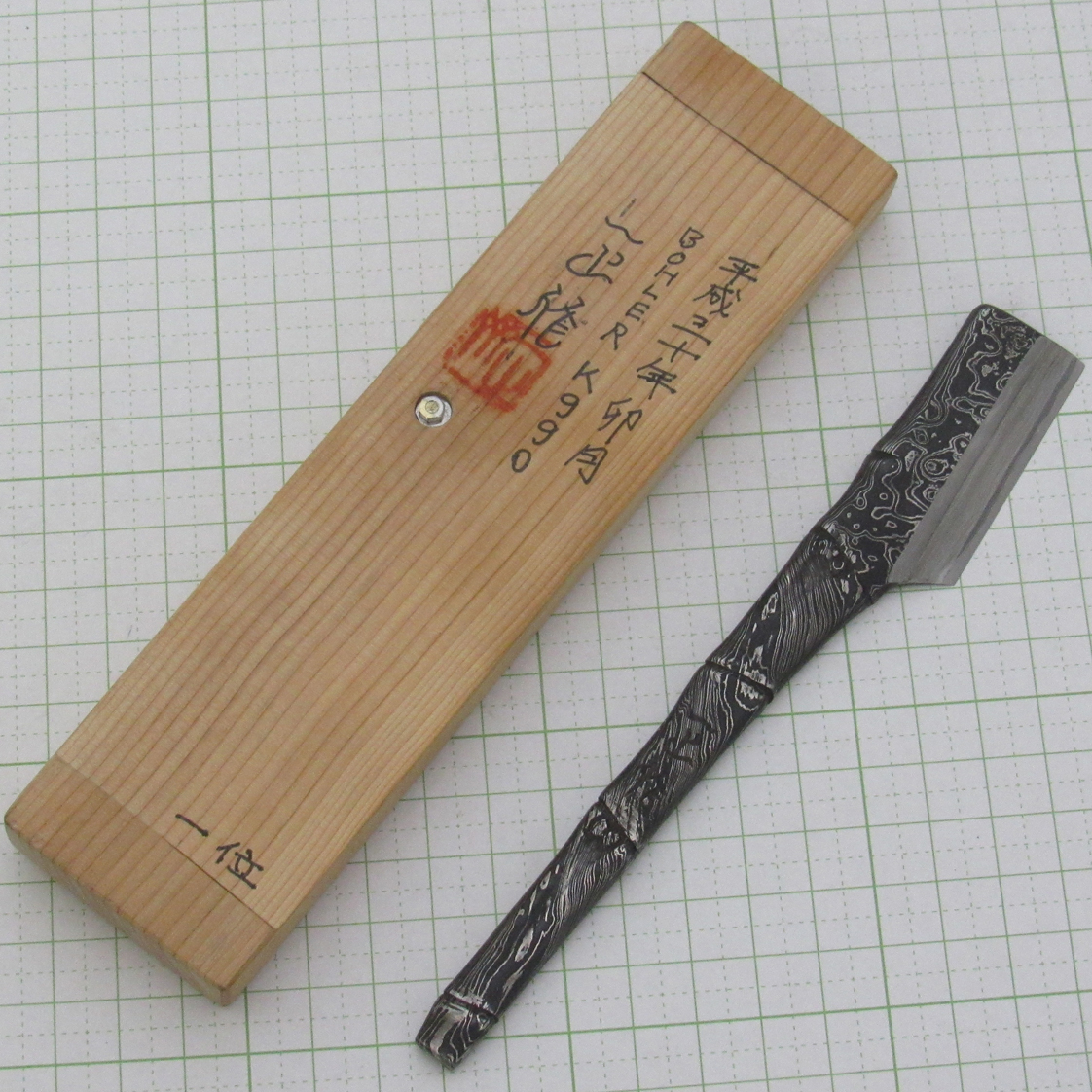 ボーラK990鋼割込み(ニッケルダマスカス) /ニッケル錬金ダマスカス柄(裏側折樋型)専用一位木箱 / 刃角度18° / 刃渡50mm / 全長165mm /重量50g