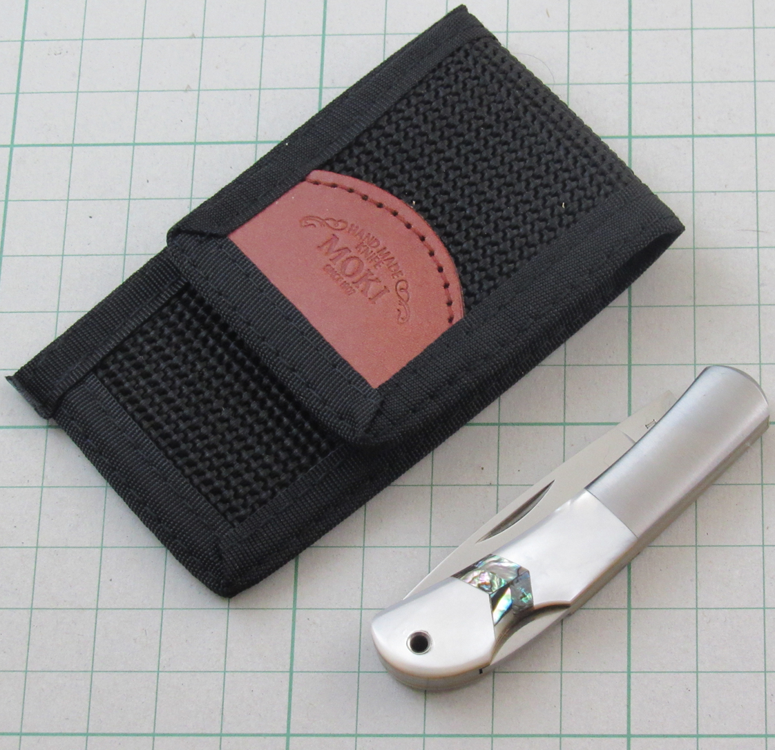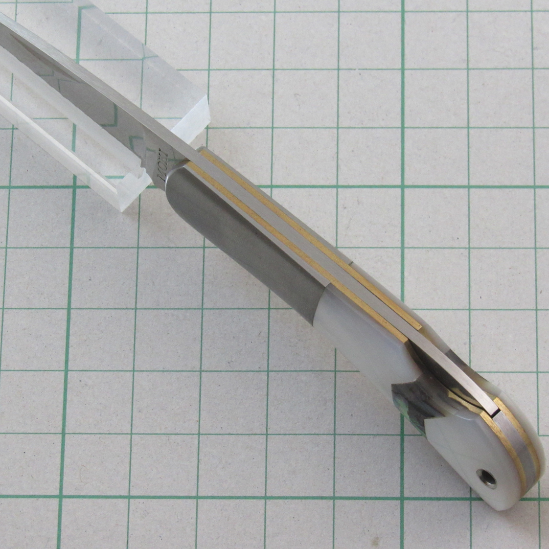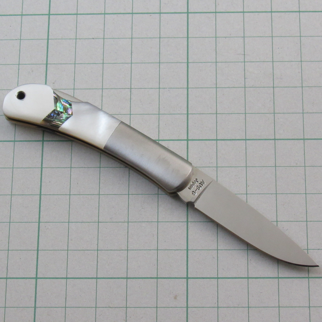 AUS-8 steel / Stainless steel bolster / White pearl shell handle (abalone shell inlay)