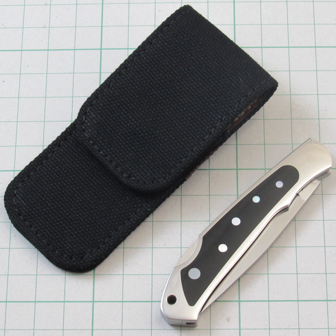 Black linen micarta (luminous shell & yellow-tailed shell) inlay