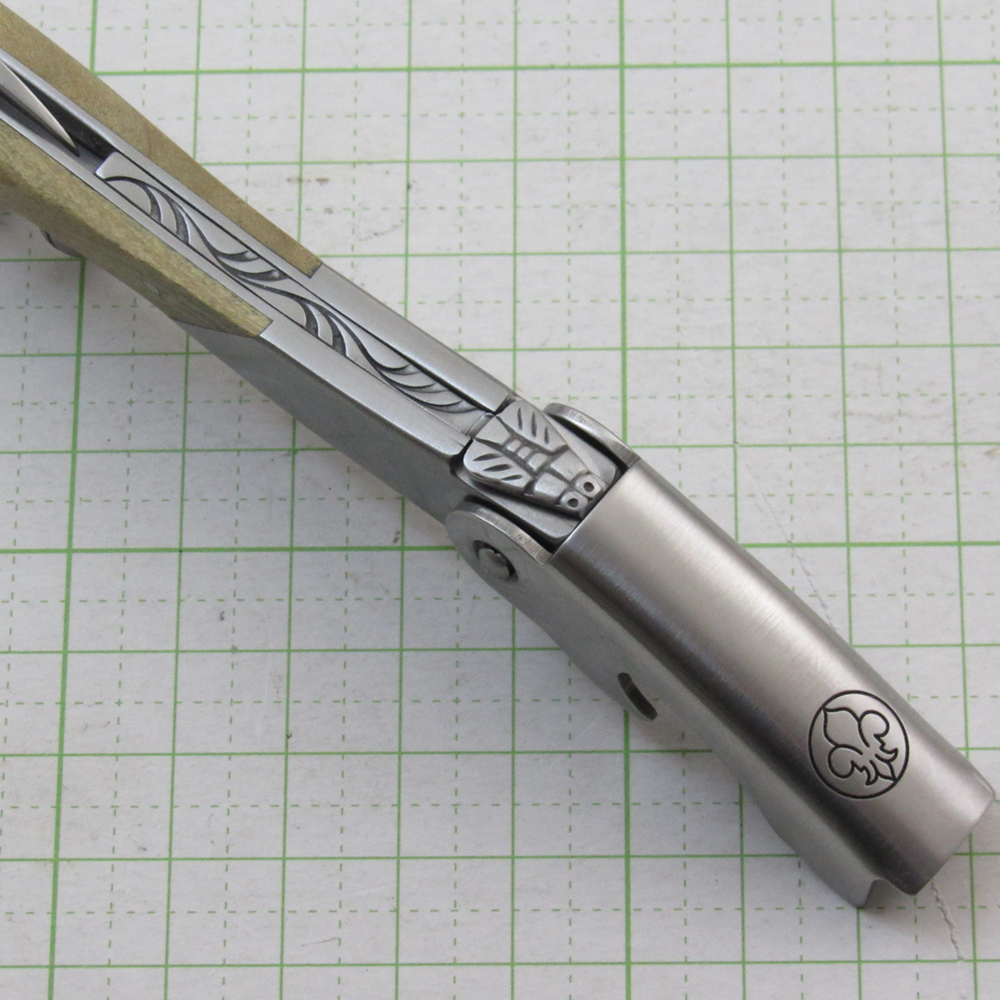 ステンレス鋼 / チューリップ(ゆり)ウッドハンドル / 全長115mm【特徴】アメリカ独立戦争支援のお礼としてフランス国王ルイ16世と王妃マリーアントワネットに贈呈された、ヴェルサイユ宮殿内の貴重な樹木をハンドル材に使用したモデル。フック部分に旧王室のマークを入れ側面にマリーアントワネットのおしるしを刻印してある。※ロイヤルブルーの専用革ケース付き※刻印があるためオリジナルネーム入れ不可