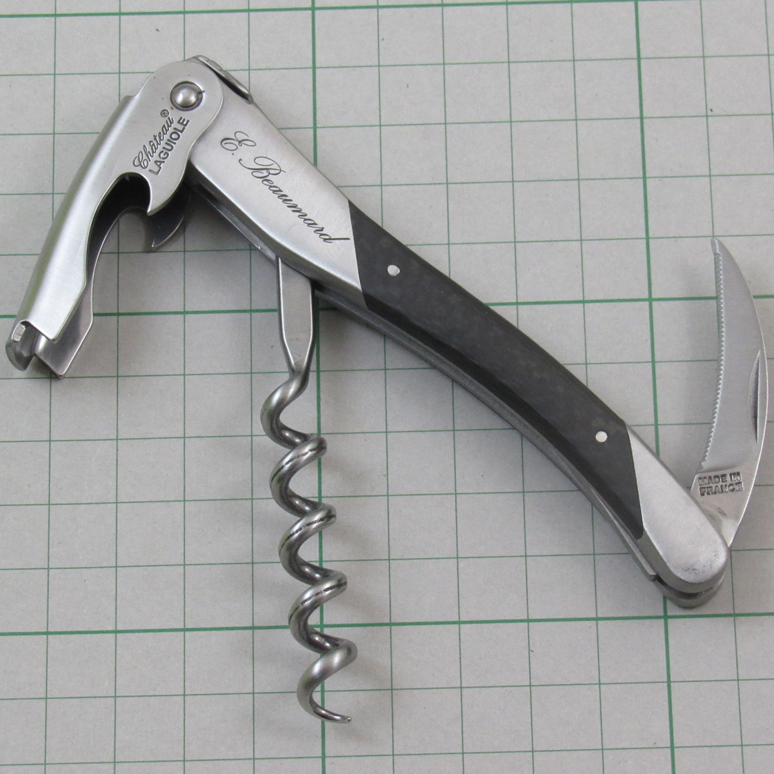 ステンレス鋼 / カーボンファイバーハンドル / ステンレス(艶消し加工)全長115mm【特徴】1998年度ソムリエコンクール準優勝者フランス人エリック・ボーマール氏のシグネチュアモデル。ハンドル部分にシャトーラギオールで唯一カーボンファイバーを採用した、非常に”クール”なモデル。※オリジナルレザーケース付き※ロットナンバ刻印※ボディサイド部分に氏のメーム刻印※ステンレス(艶消し加工)※オリジナルネーム入れ可能