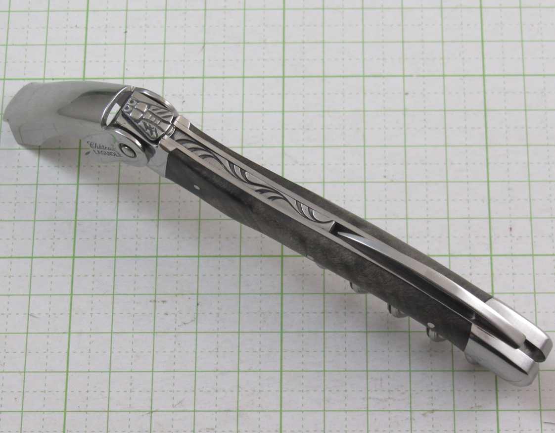 ステンレス鋼 / ハンドル材 – バックアイバールウッド(北米産トチの木)全長115mm【特徴】バックアイの根元部分に出たコブを採用。黄色と青みがかった灰色の色調が美しいモデル。※専用革ケース付き※ステンレス(鏡面加工)