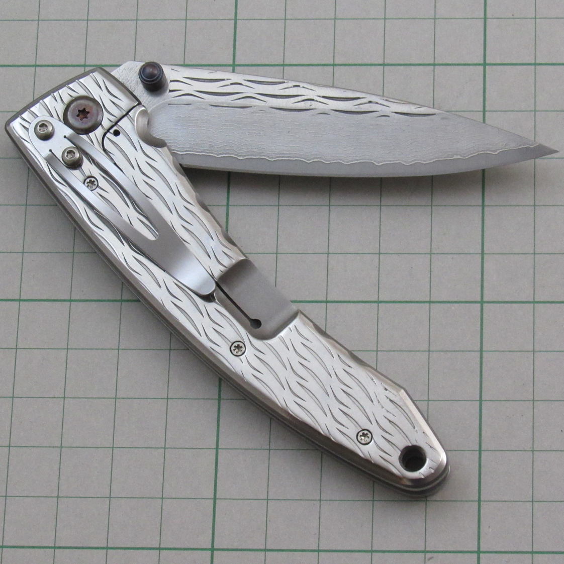 V gold No. 10 Damascus steel (33 layers) / Handle material – 420J2 stainless steel / Frame lock blade length 85mm / Handle length 110mm / Weight 113g *Belt clip included